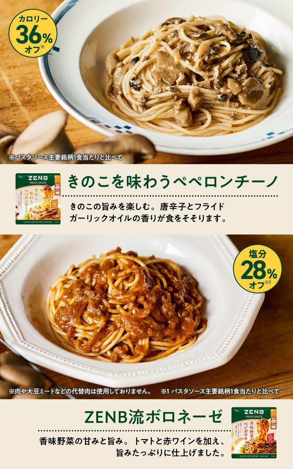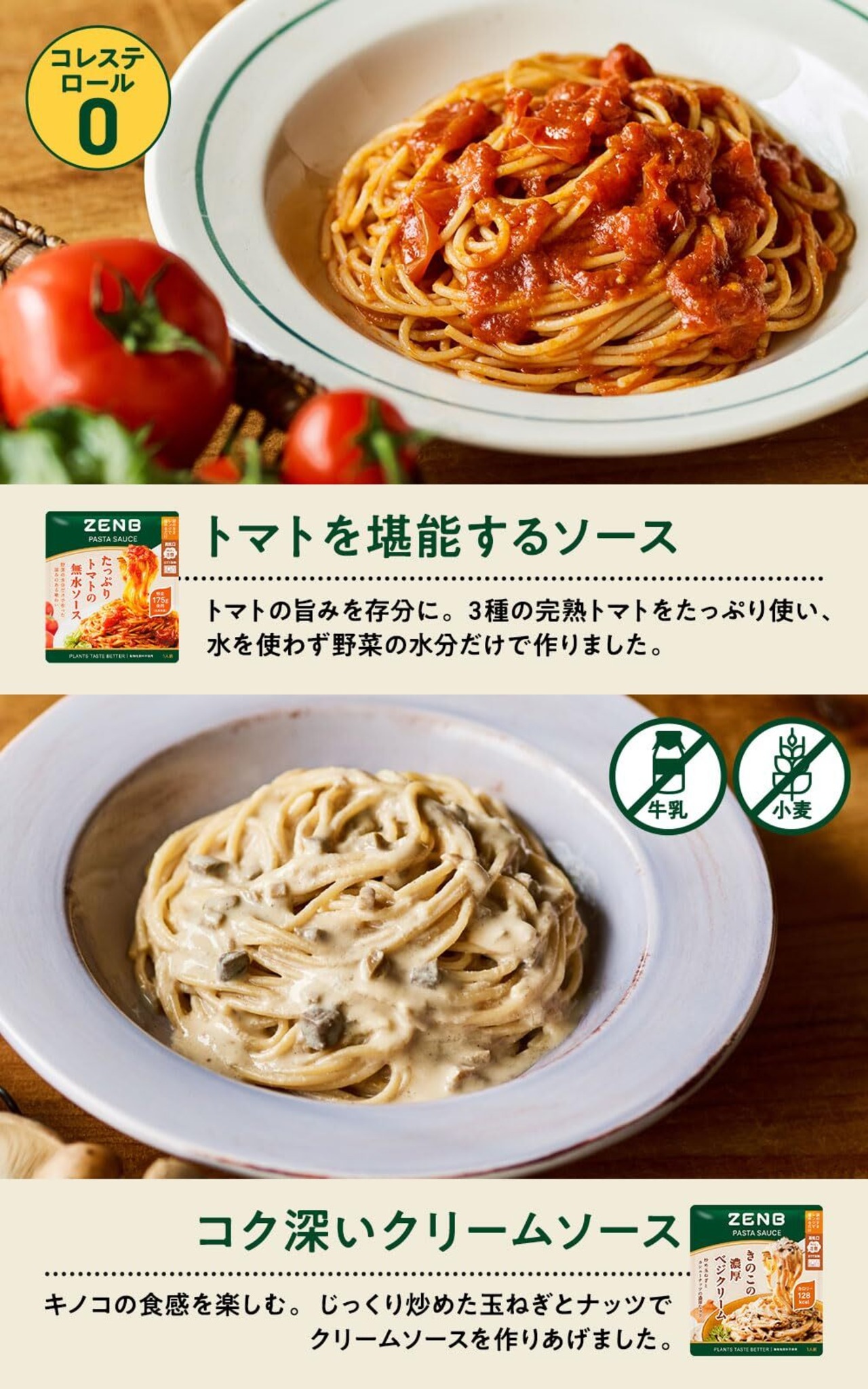 パスタソースは4種類:おいしさを追及したこだわりの厳選素材を使用。プラントベース。いつものパスタソースよりもヘルシー*6で、さらに嬉しいグルテンフリー。食物繊維たっぷりのゼンブヌードルで罪なきパスタが楽しめます。*6パスタソース主要銘柄1食当たりと比べて たっぷりトマトの無水ソース・きのこの濃厚ベジクリーム:塩分23%オフ、香味野菜のベジボロネーゼ:塩分28%オフ、きのこ味わうペペロンチーノ:カロリー36%オフ( 23年10月自社調べ)