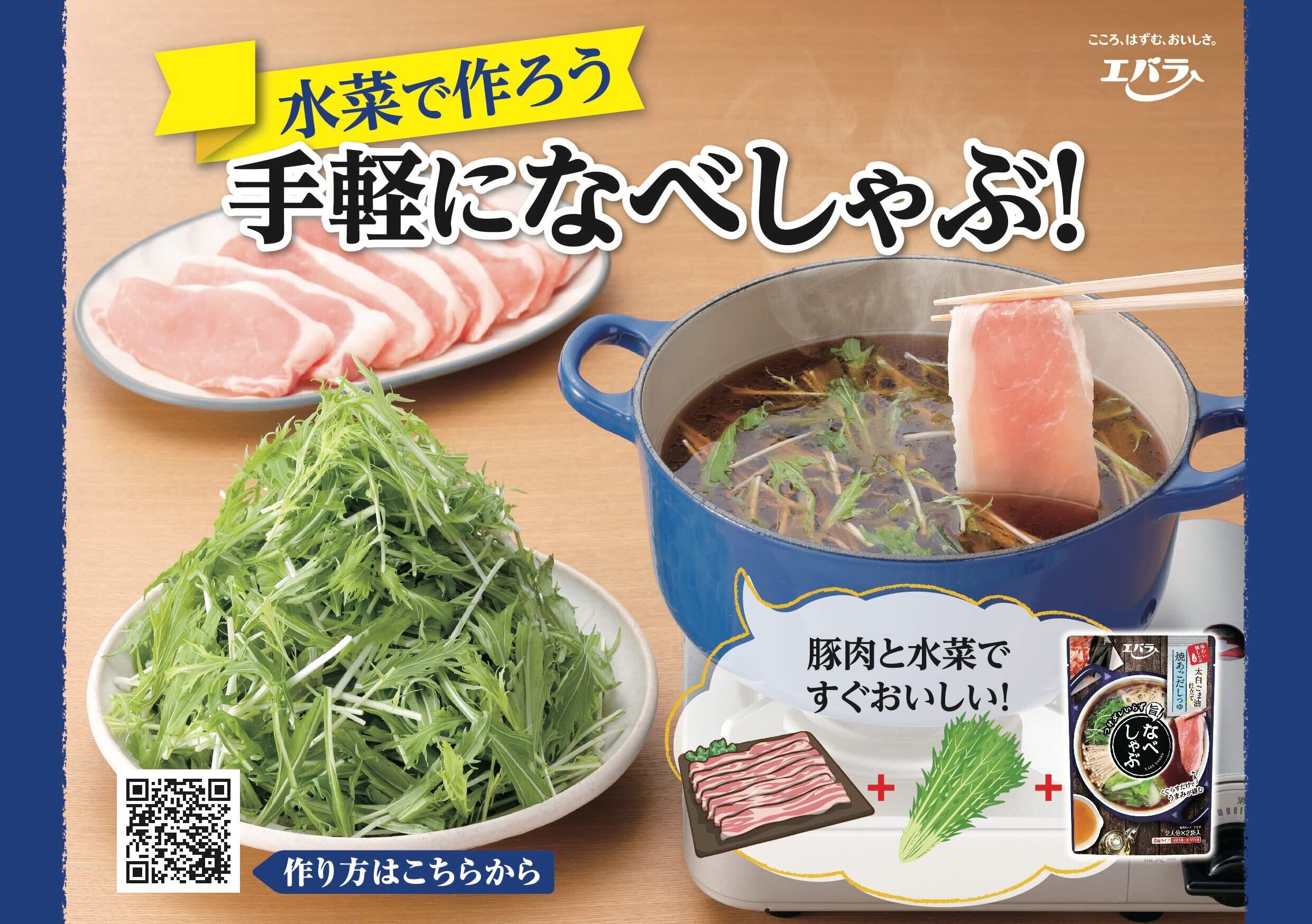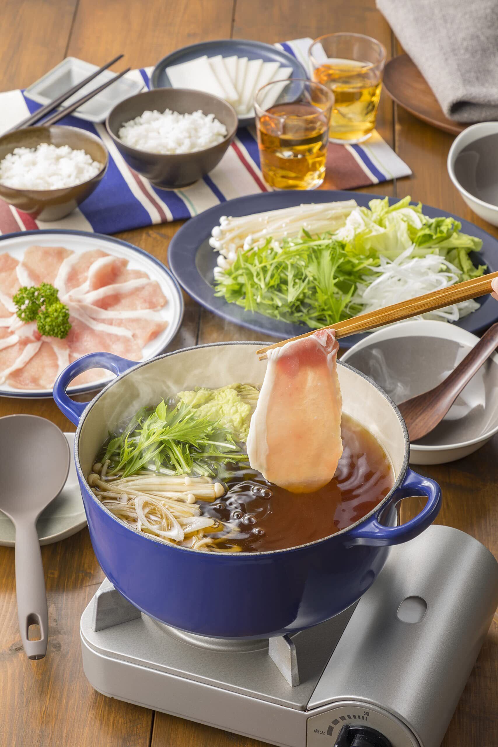 【1】材料例(2人分) 内袋(本品)1袋、水350ml、豚肉(しゃぶしゃぶ用)200g、白菜1/8株(約200g)、長ねぎ1本(約60g)、えのきたけ1/2袋(約50g)、水菜1/4束(約50g) 【2】おいしい作り方 1.内袋1袋と水350mlを鍋に入れます。2.豚肉以外の具材を約半量入れて軽くひと煮立ちさせます。3.豚肉をしゃぶしゃぶして、火が通ったら出来あがりです。※野菜が少なくなってきたら、適宜残りの具材を加えてください。※お好みにより、水で味の濃さを調整してください。