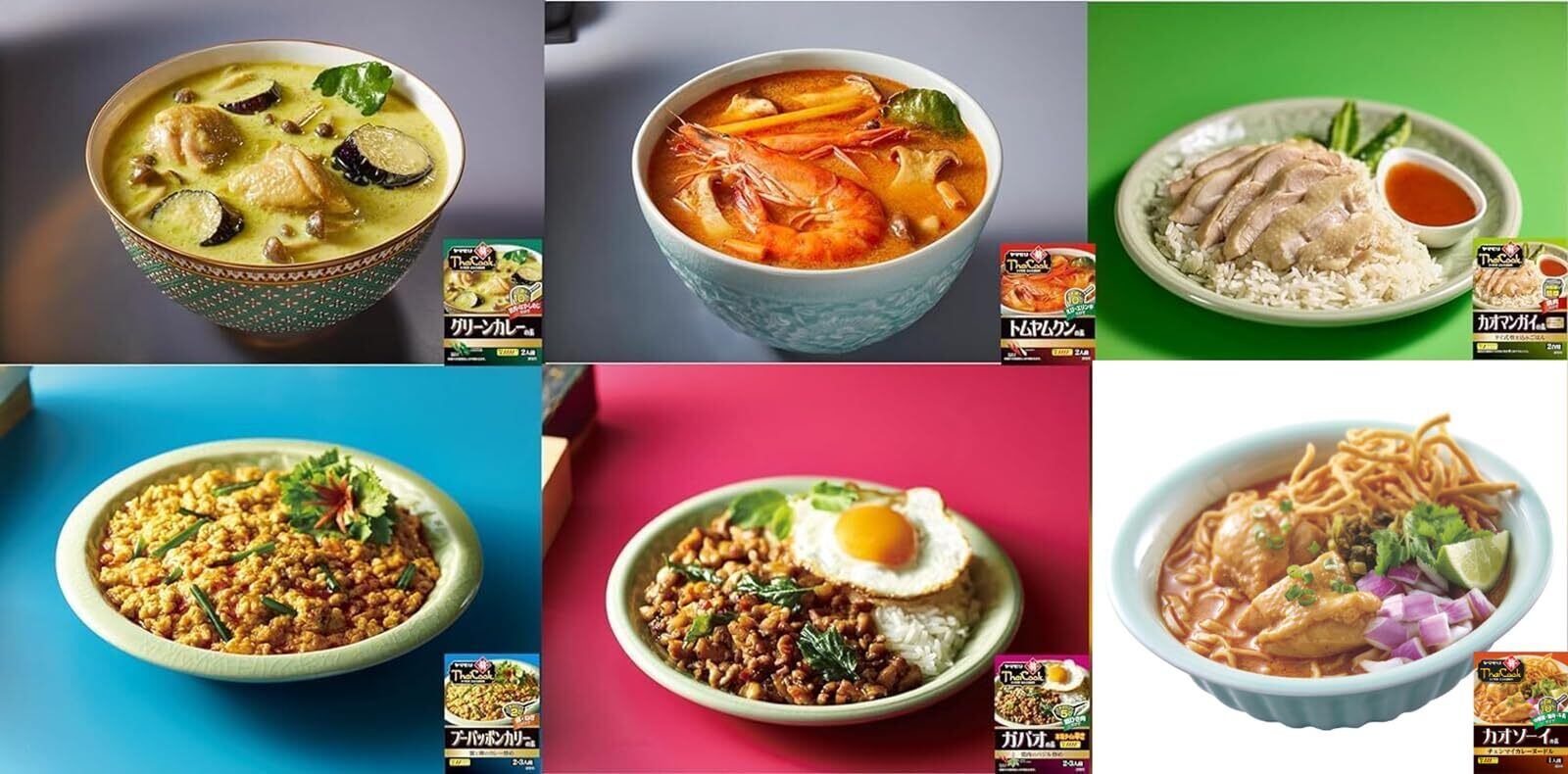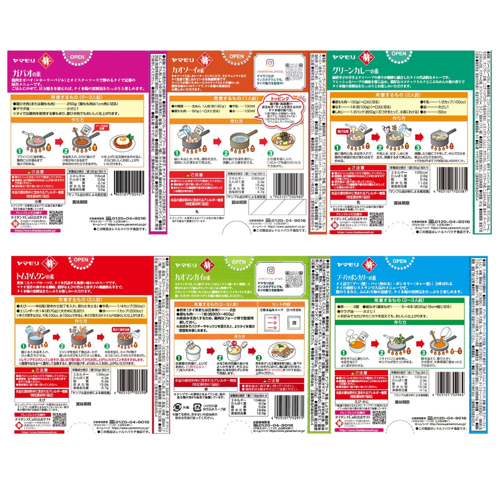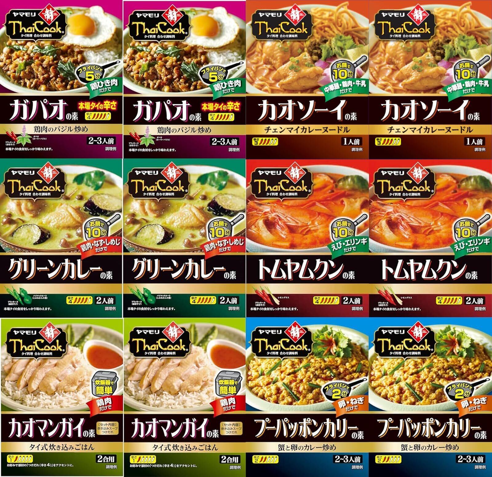 ヤマモリのタイクック全6種類 各2個(グリーンカレーの素、トムヤムクンの素、カオマンガイの素、プーパッポンカリーの素、ガパオの素 本場タイの辛さ、辛くないガパオの素)をセットにしました。