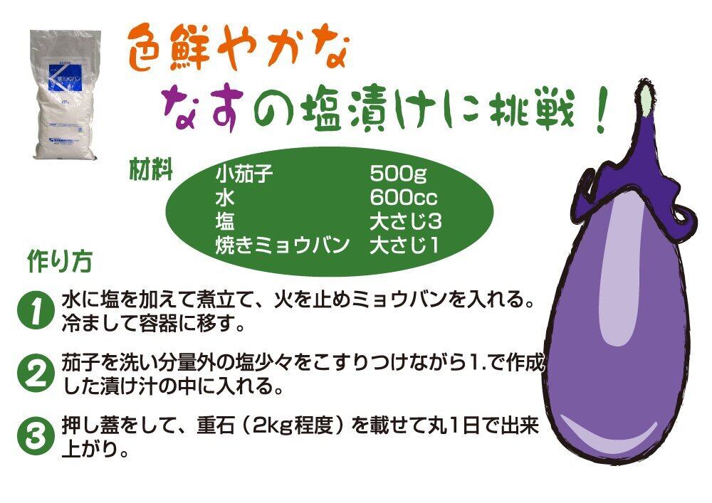 塩小サジ2杯に本品小サジ1杯をまぜ合わせ、ヘタをつけたままのなす全体にまぶして軽くもみ4~5分おいてから、ぬか床に漬けると美しい色に漬かります。