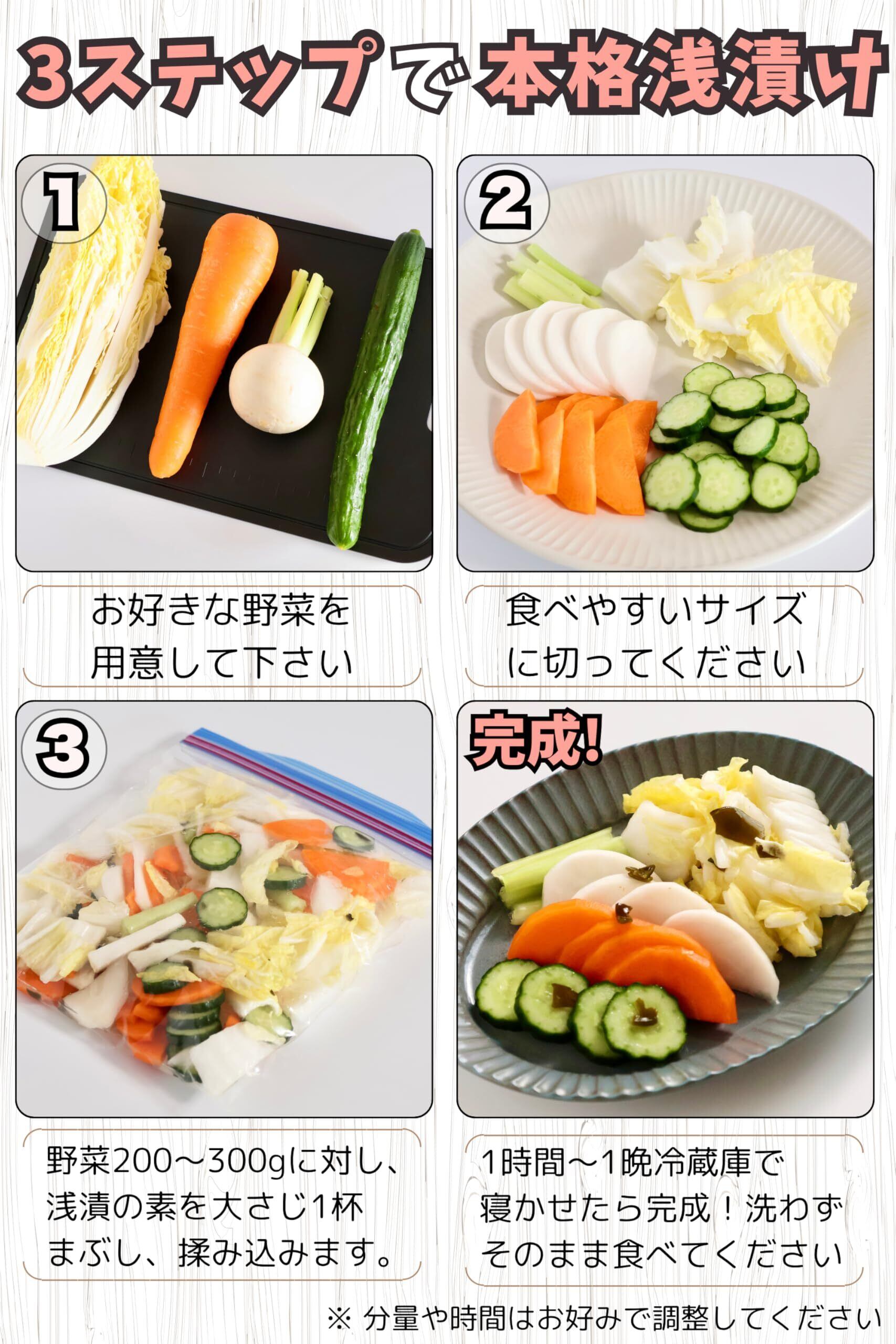 野菜に混ぜて一晩ねかせるだけで、本格的な浅漬けのできあがり。
