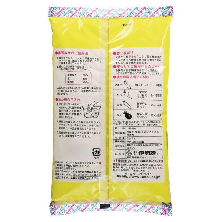 補充用に適した配合のいりぬかで、化学調味料や食品添加物が無添加。旬の野菜で簡単に美味しい糠漬けが作れます。