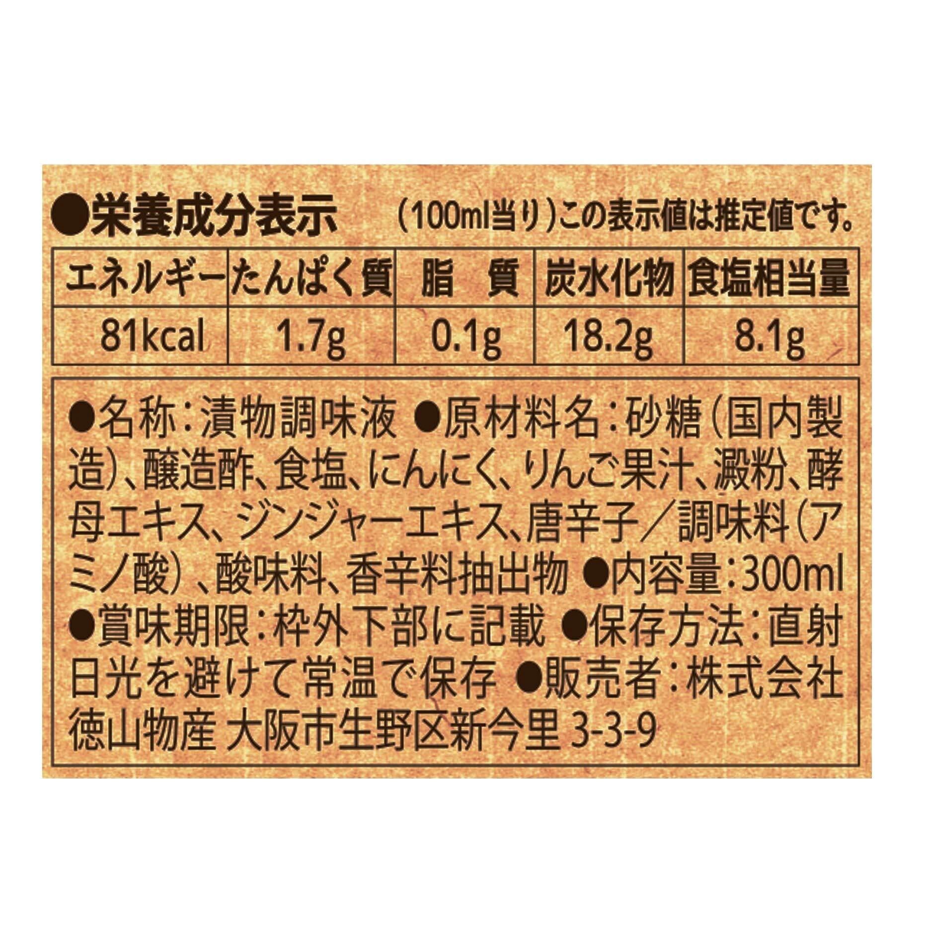 原材料:砂糖(国内製造)、醸造酢、食塩、にんにく、りんご果汁、澱粉、酵母エキス、ジンジャーエキス、唐辛子/調味料(アミノ酸)、酸味料、香辛料抽出物