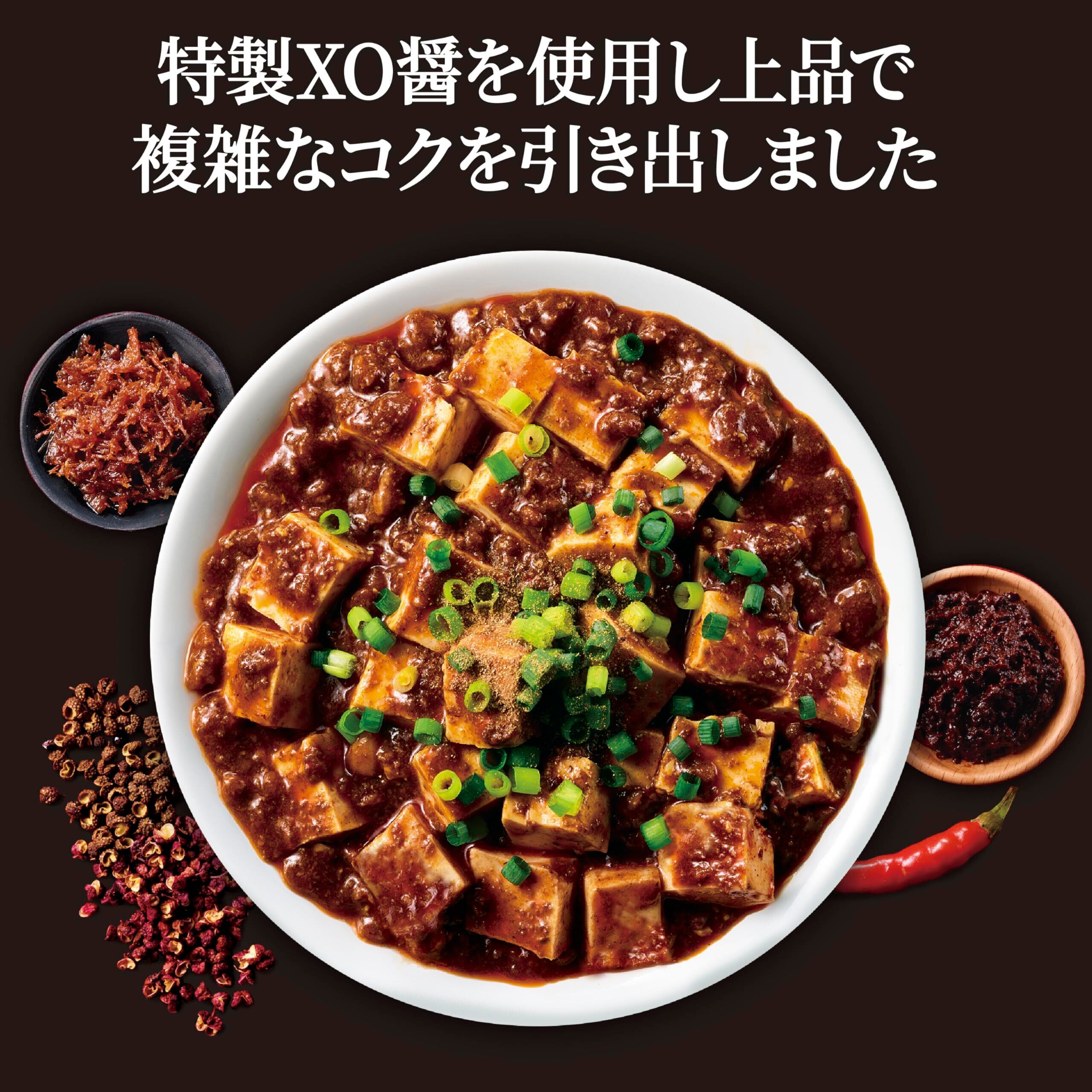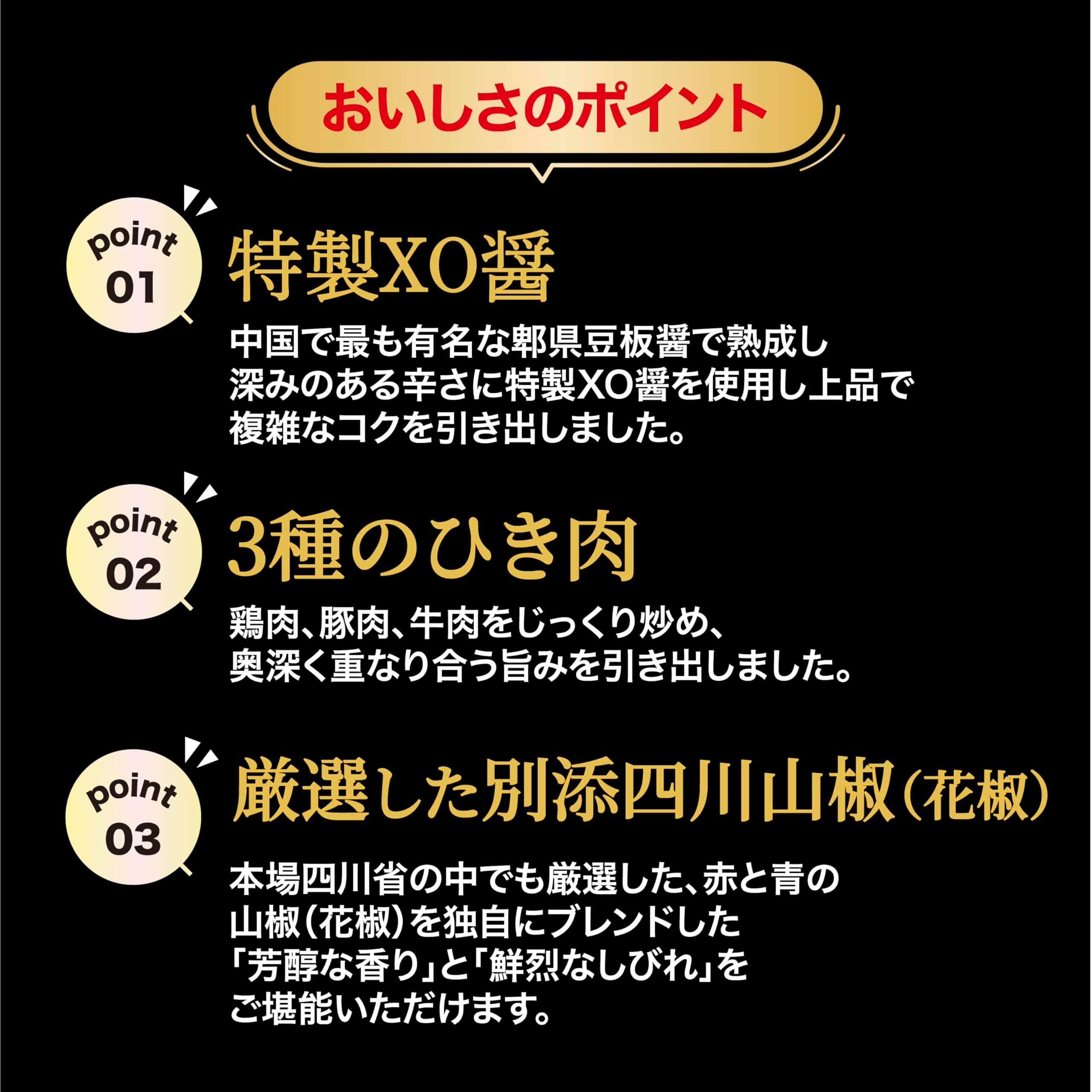 ソース:食肉(鶏肉、牛肉)、味付け豚肉(豚肉、香辛料)、食用油脂(なたね油、ラード)、水飴、しょうゆ、豆板醤、甜麺醤、豆豉、魚醤、ビーフエキス、XO醤、発酵調味料、ポークブイヨン、砂糖、ほたて貝エキス、粒状植物性たん白、香辛料、たん白加水分解物、香味食用油、食塩、えび粉末/増粘剤(加工でん粉、増粘多糖類)、調味料(アミノ酸等)、着色料(パプリカ色素、カラメル、紅麹)、香辛料抽出物、(一部に乳成分・小麦・えび・牛肉・ごま・大豆・鶏肉・豚肉を含む)、別添スパイス:さんしょう