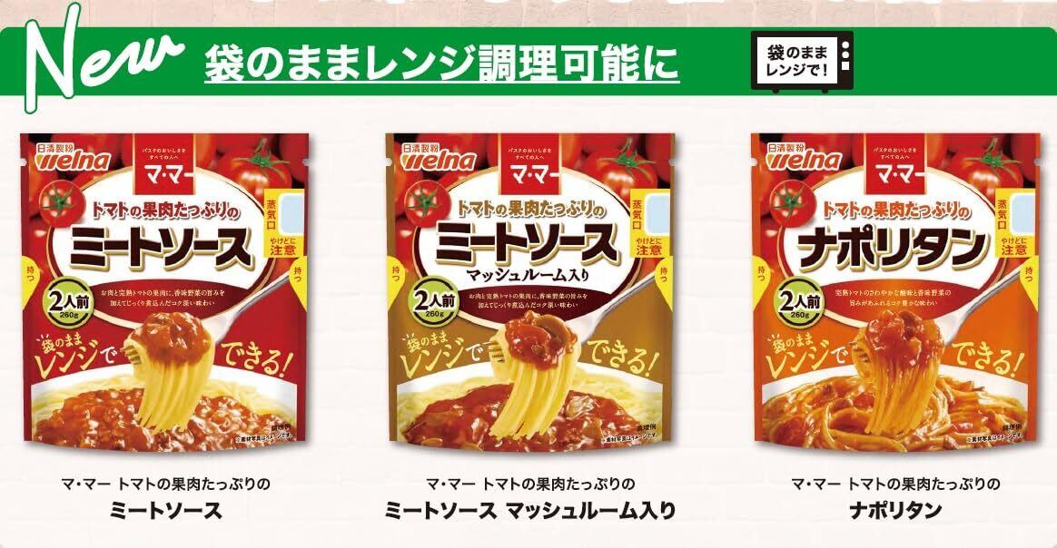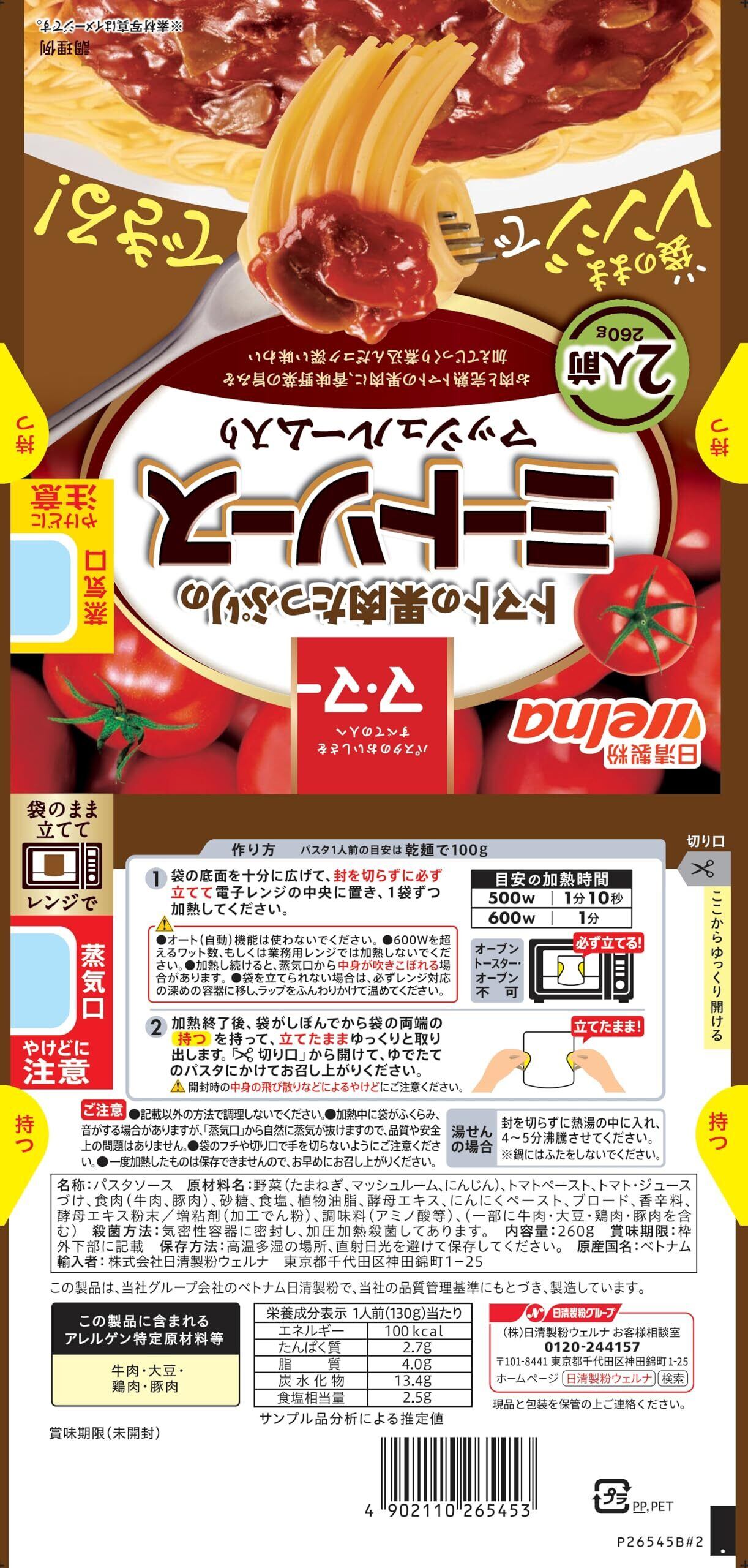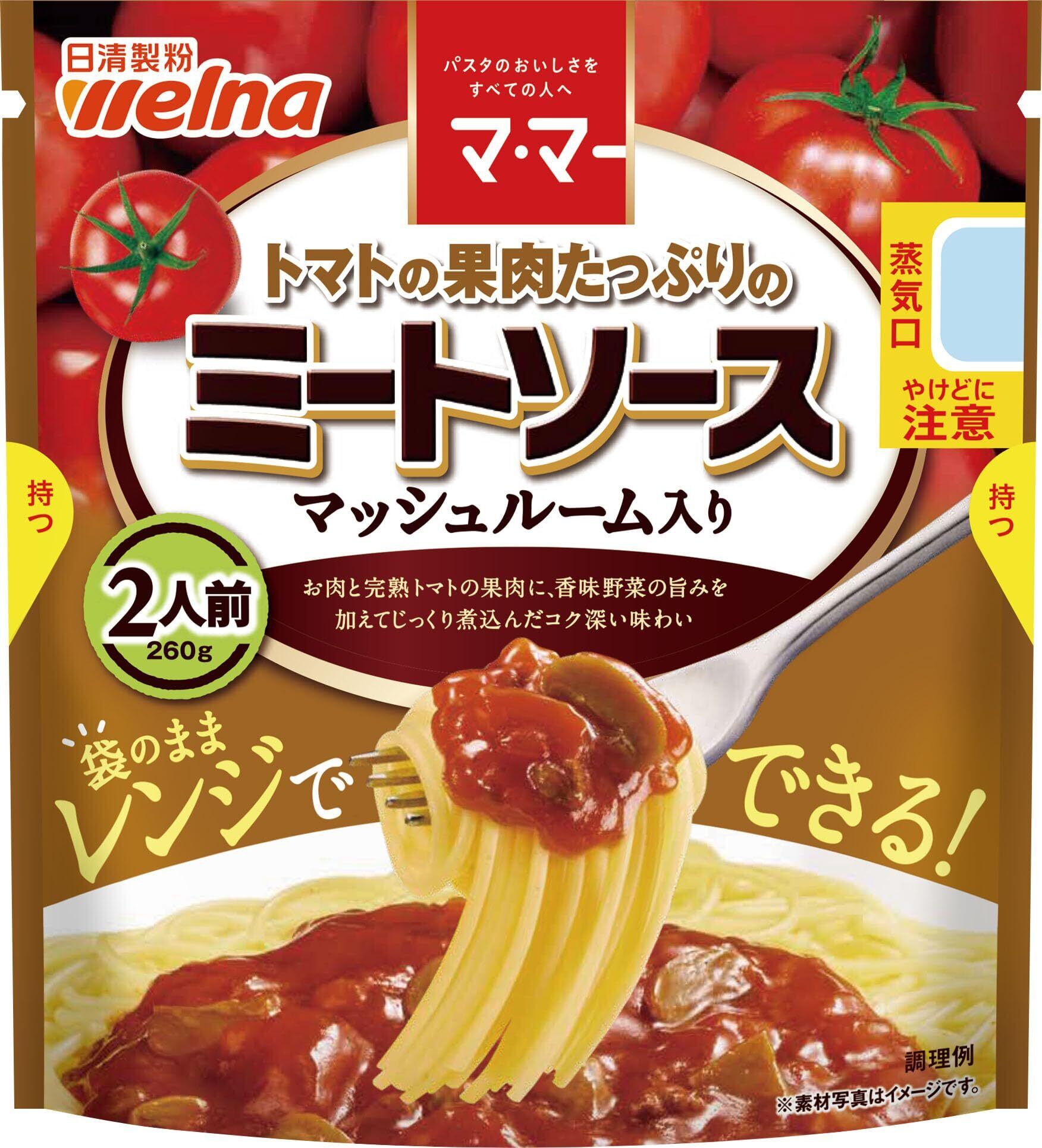 マ・マー トマトの果肉たっぷりの ミートソース マッシュルーム入り 2人前 ( 260g ) × 6袋 パスタソース 袋のままレンジ調理 500W / 1分10秒 手軽 時短 簡単 調理 ( 常温保存/常備食 )防災