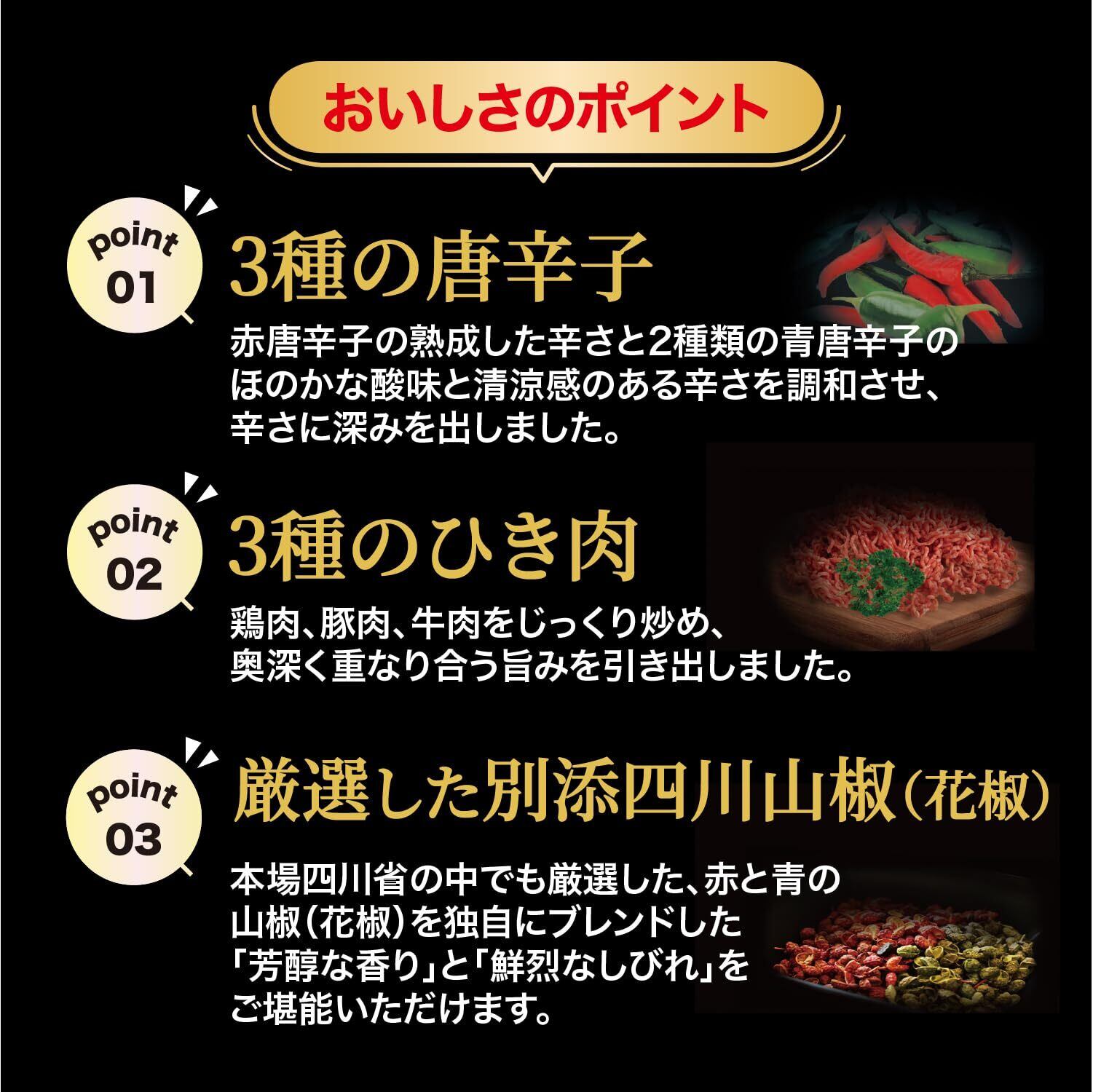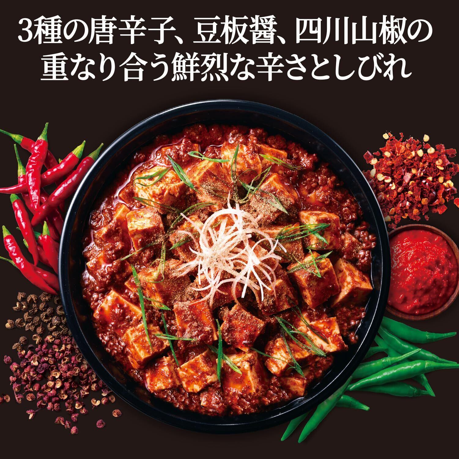 <ソース>食肉(鶏肉(国産)、牛肉)、食用油脂(なたね油、ラード)、豆板醤、しょうゆ、味付け豚肉(豚肉、香辛料)、粒状植物性たん白、香味油、香辛料、ビーフエキス調味料、砂糖、トウチ醤、発酵調味料、ガーリックペースト、たん白加水分解物、ヤラピノピューレ、チキンブイヨン、食塩/増粘剤(加工でん粉)、調味料(アミノ酸等)、着色料(カラメル、パプリカ色素)、酸味料、(一部に乳成分・小麦・牛肉・大豆・鶏肉・豚肉を含む)<別添スパイス>さんしょう