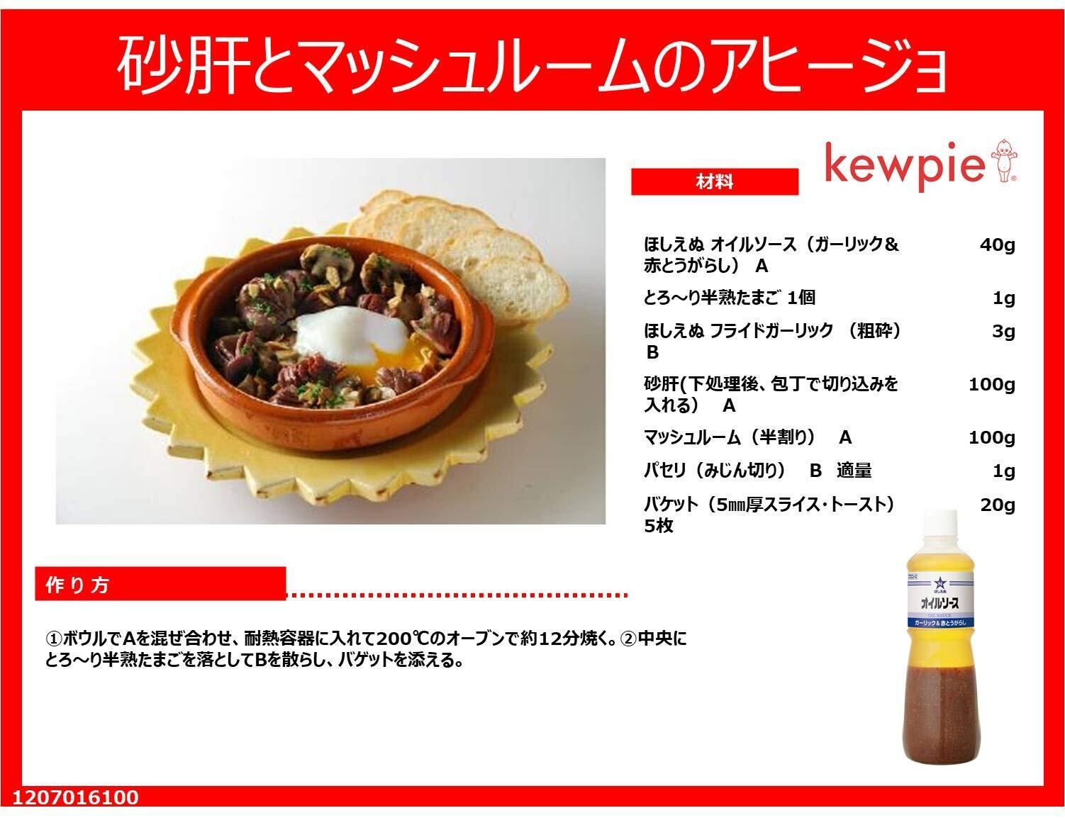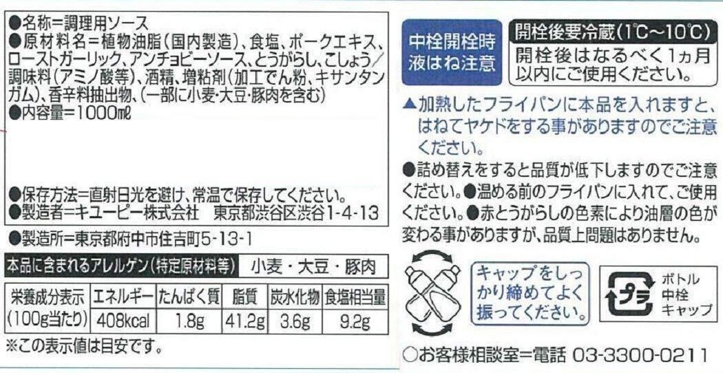 原材料:植物油脂(国内製造)、食塩、ポークエキス、ローストガーリック、アンチョビーソース、とうがらし、こしょう/調味料(アミノ酸等)、酒精、増粘剤(加工でん粉、キサンタンガム)、香辛料抽出物、(一部に小麦・大豆・豚肉を含む)