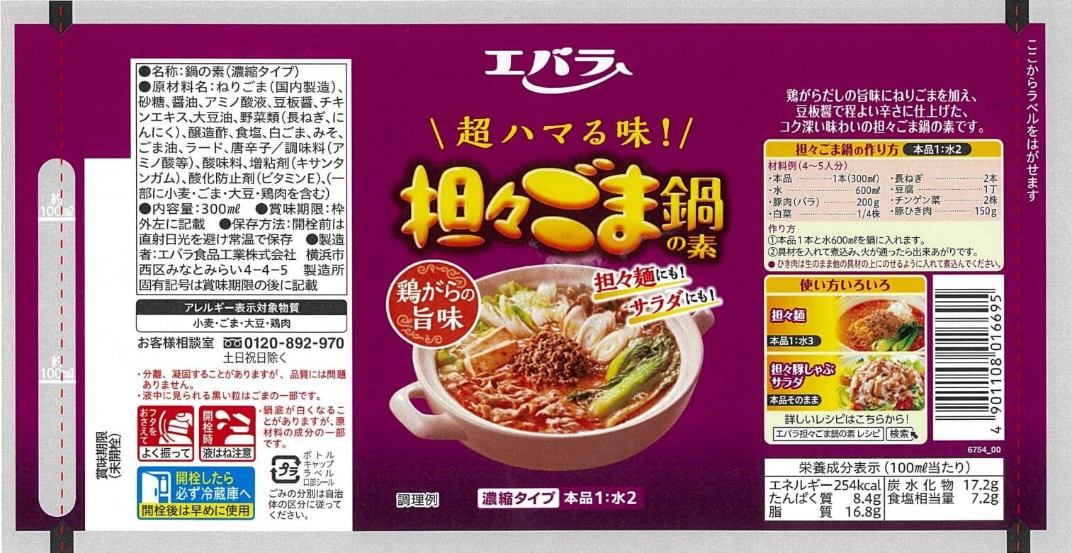 原材料:ねりごま(国内製造)、砂糖、醤油、アミノ酸液、豆板醤、チキンエキス、大豆油、野菜類(長ねぎ、にんにく)、醸造酢、食塩、白ごま、みそ、ごま油、ラード、唐辛子/調味料(アミノ酸等)、酸味料、増粘剤(キサンタンガム)、酸化防止剤(ビタミンE)、(一部に小麦・ごま・大豆・鶏肉を含む)