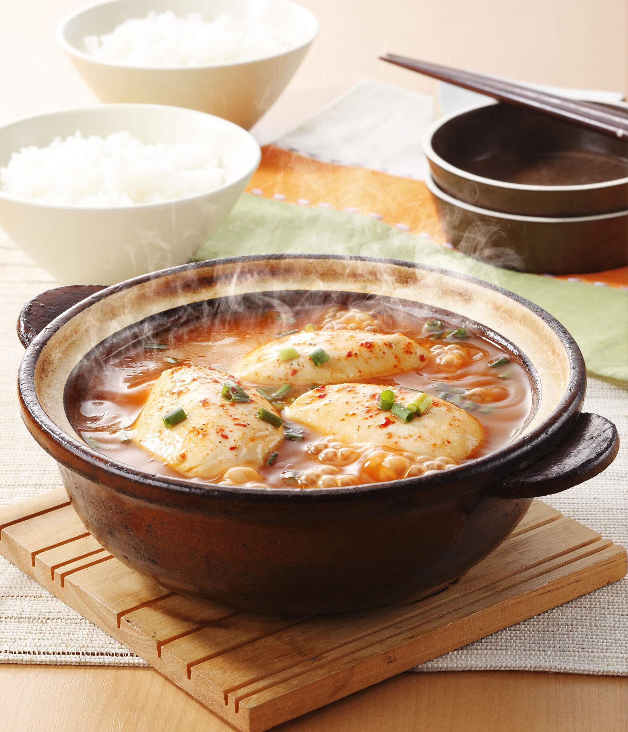 【豆腐と卵ですぐできる!】鍋に「スンドゥブチゲの素」を入れて豆腐と卵を入れるだけ!美味しいスンドゥブチゲを作る事ができます。アサリ・カニ・ホタテ・エビの旨味が溶け込んだスープをごま油で香り高く、タテギでコク深い辛さに仕上げました。