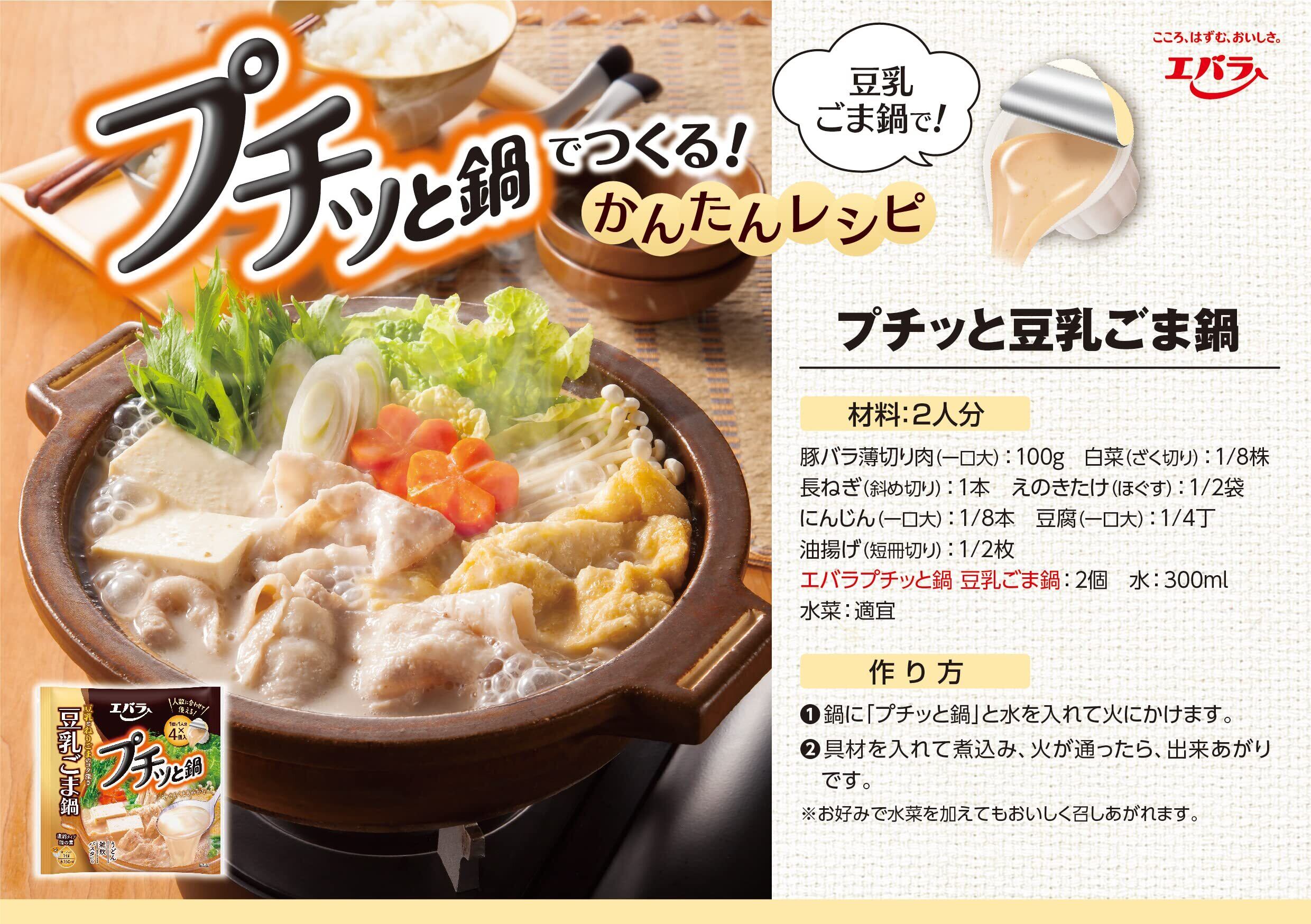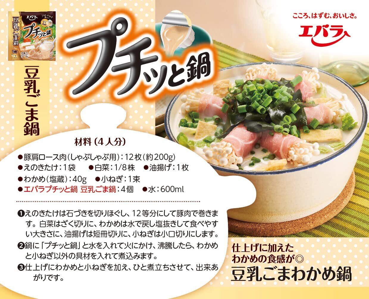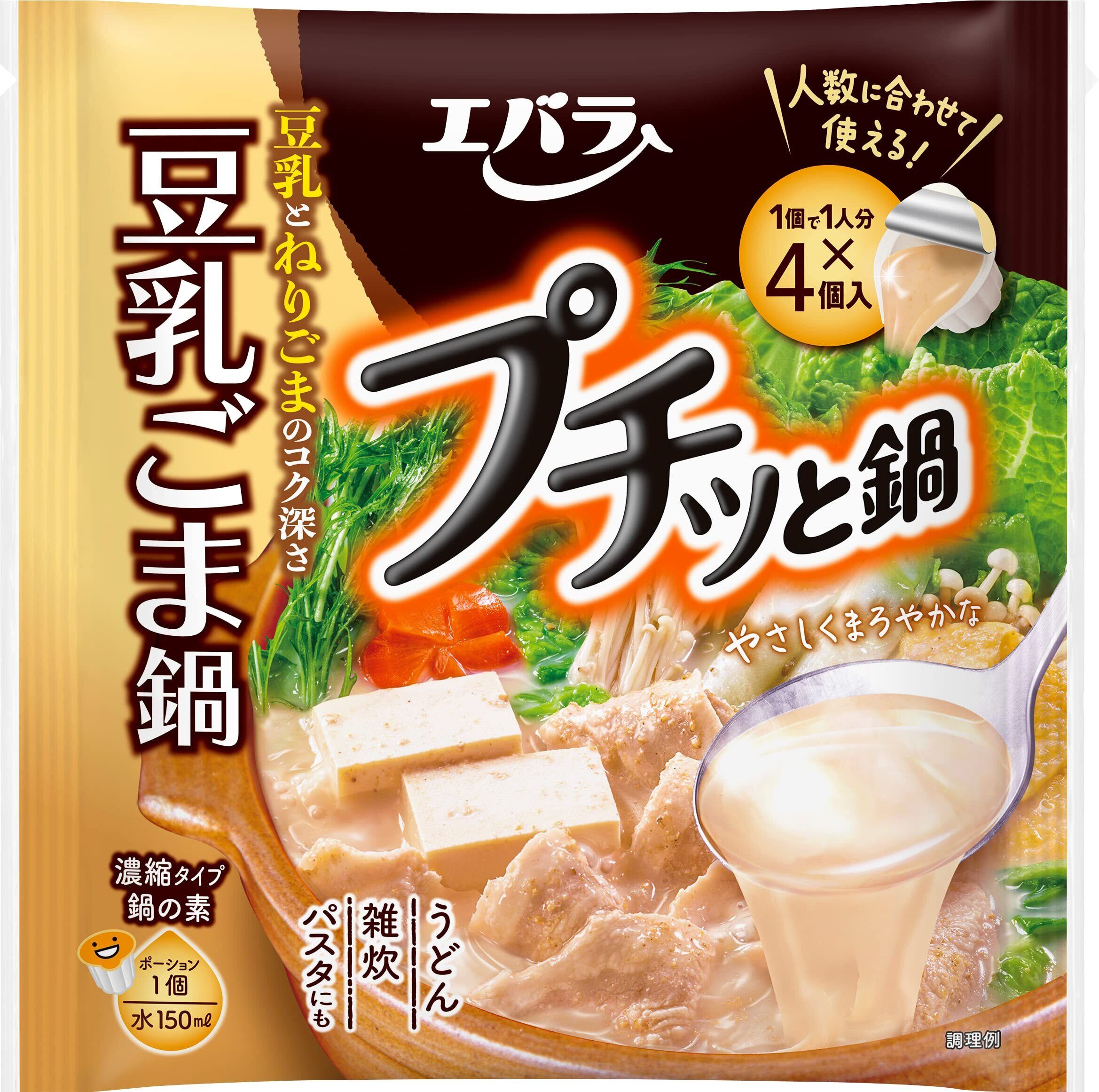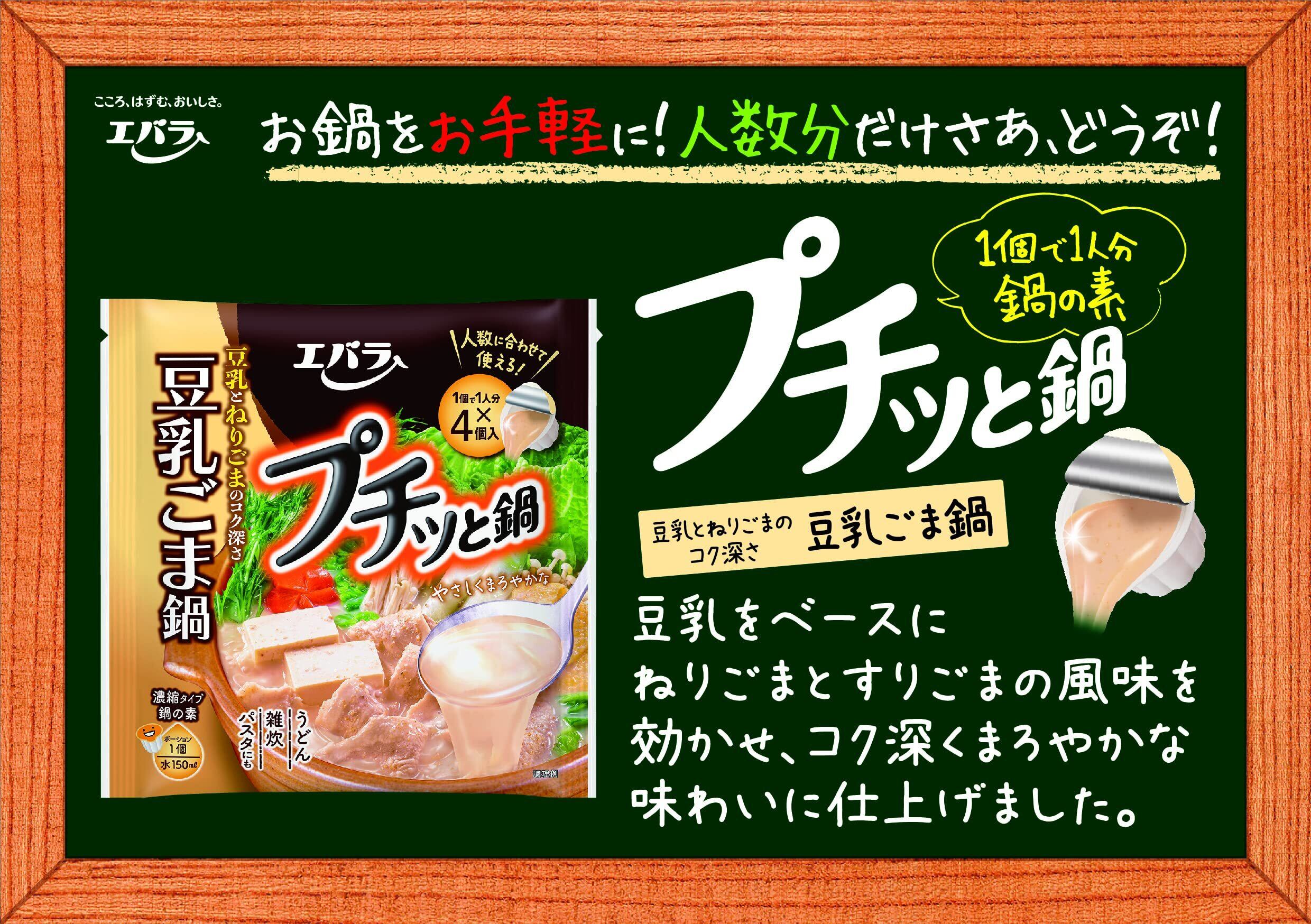 この「エバラ プチッと鍋 豆乳ごま鍋 (40g×4P)」は、豆乳をベースにねりごまとすりごまの風味を効かせ、コク深くまろやかな味わいに仕上げました。1人で食べるお手軽鍋から、家族で食べるごちそう鍋まで、いつでも作りたい分に合わせて「おいしい鍋」を手軽に作ることができる「1個で1人分鍋の素」です。