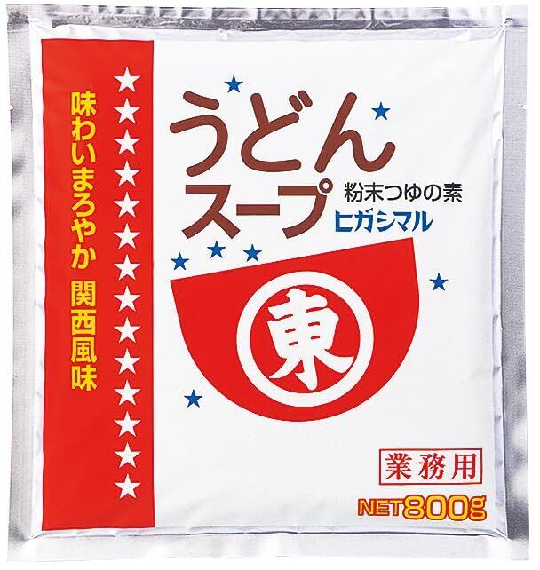 ヒガシマル醤油は天正年間から四百年以上にわたり醤油を造り続けております。当社の淡口醤油は素材の持味を生かすために開発された醤油で濃口醤油はくせのないおだやかなものでしょうゆのうまみを味わえます。また、原料にこだわり、地産地消を地元の契約農家とともにすすめております。真昆布のうまみとかつお節のコクを利かせ、うすくち醤油でまろやかに仕上げた粉末うどんスープです。