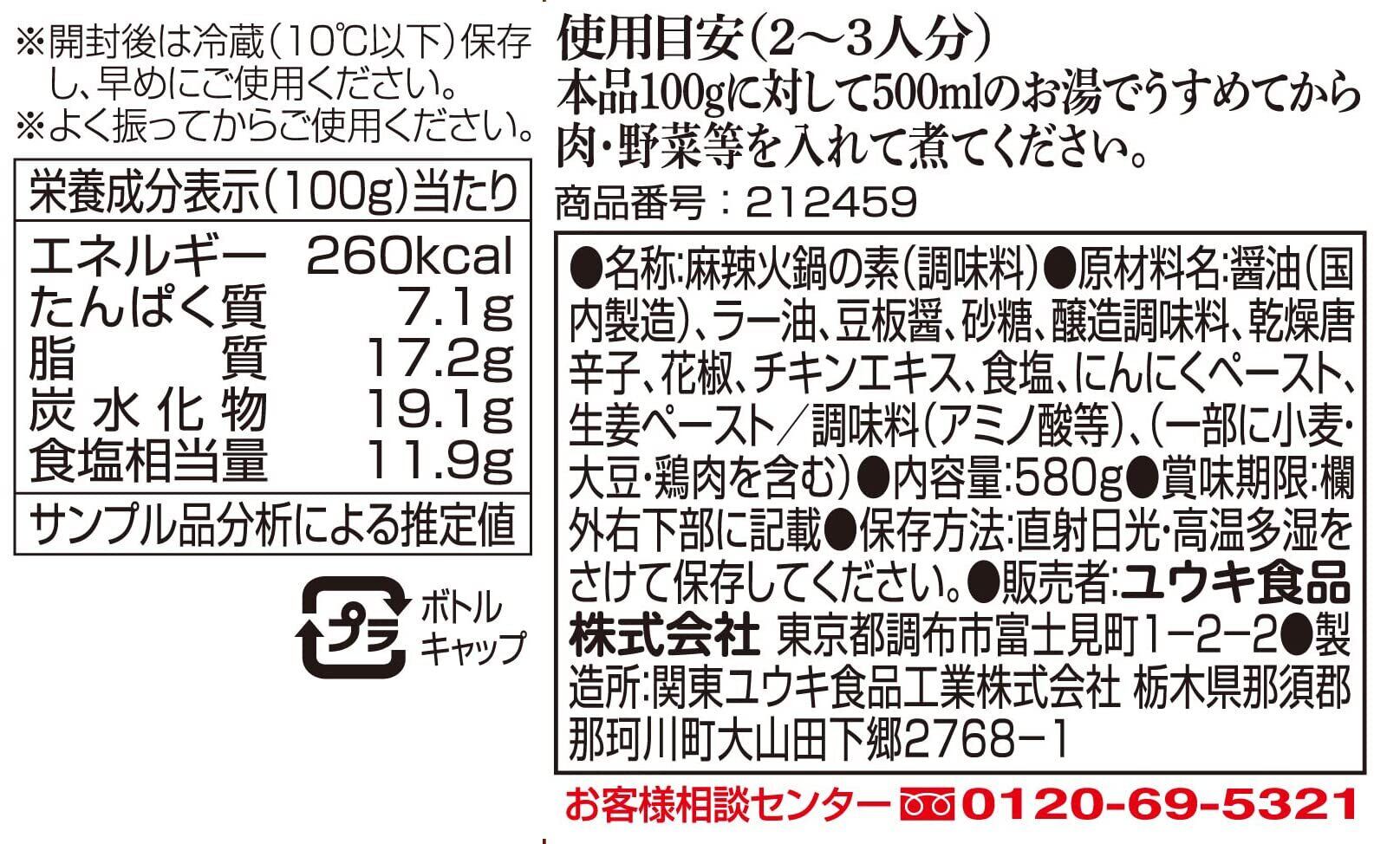 ユウキ食品 麻辣火鍋の素 580g(シビ辛 5倍希釈)