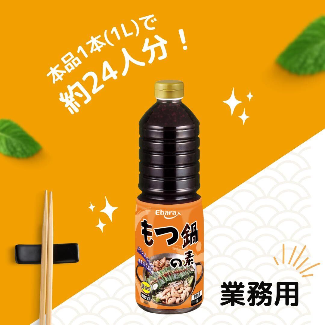 【あっさり醤油味】魚介と鶏がらの旨味を合わせ、隠し味に魚醤とにんにくの旨味を加えた、あっさり醤油味のもつ鍋の素です。モツ肉以外にも豚コマ肉や鶏モモ肉でも美味しくお召し上がりいただけます。本品1本1L(約1.190g)で約6鍋分(約24人分)のもつ鍋を作ることができます。※5倍希釈の場合