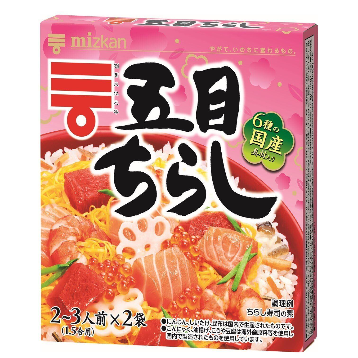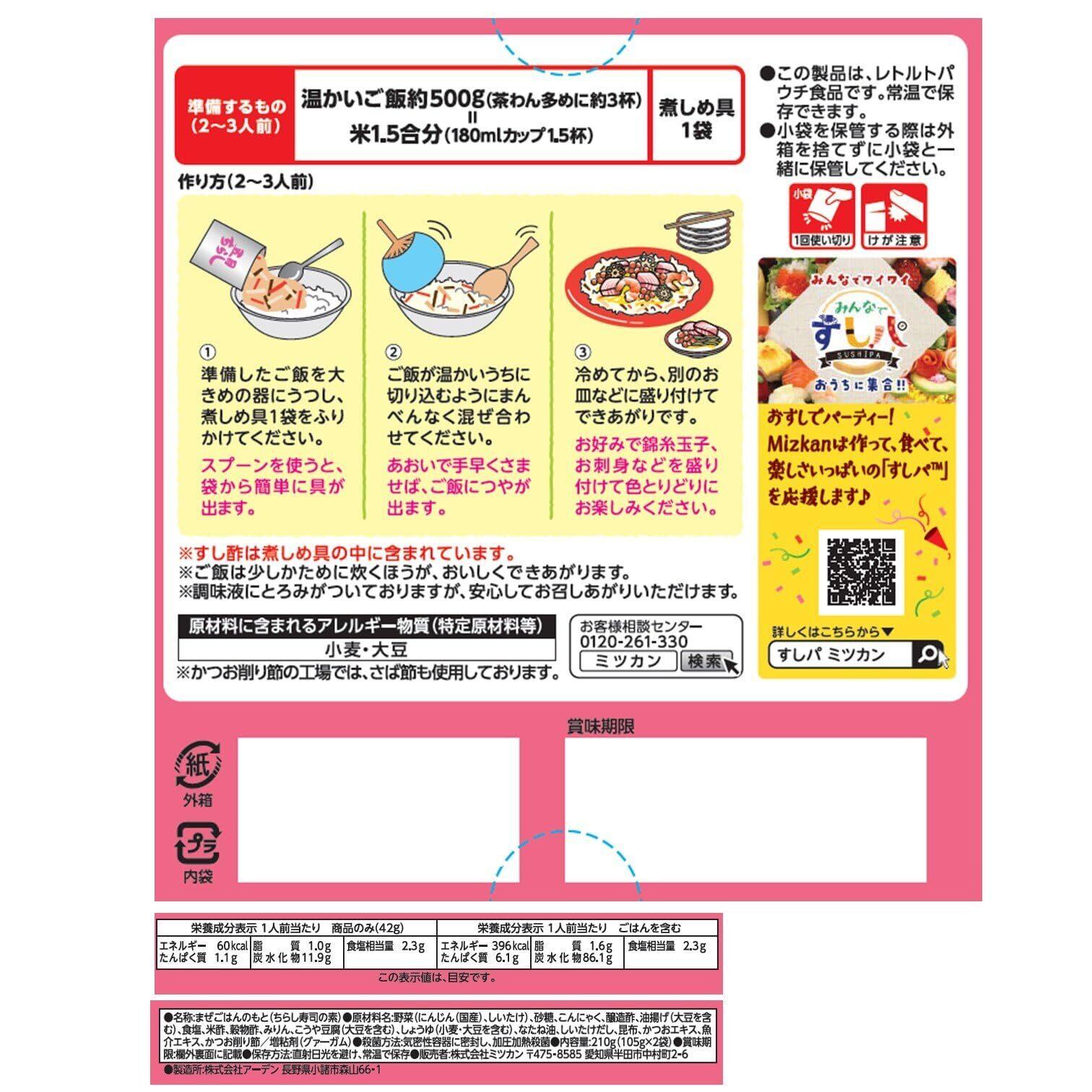 6種類の国産具材を使用した、彩り鮮やかなちらし寿司の素(寿司の素、すしの素)です。ご飯に混ぜるだけの手軽さでちらし寿司が出来上がります。甘味・酸味・塩味・旨味のバランスのよいおいしさにこだわった酢飯の味なので、普段のお食事からハレの日には色々なトッピングをして、家族みんなでお楽しみいただけます。2~3人前×2袋入りです。