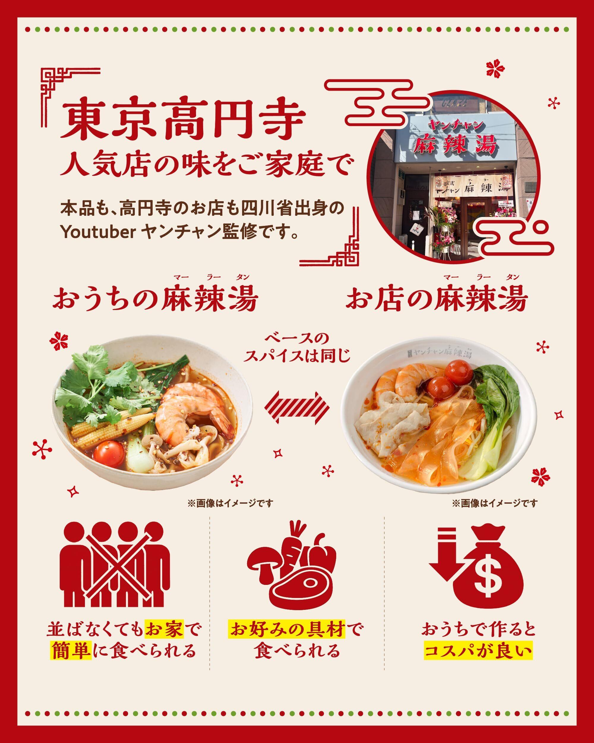 【おうちで簡単に麻辣湯】用意するのは、お好きな具材とヤンチャン麻辣湯だけ!具材と本商品を入れて煮込めば、今人気の麻辣湯をご家庭で簡単に楽しめます。