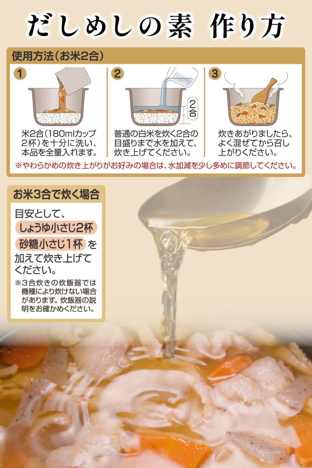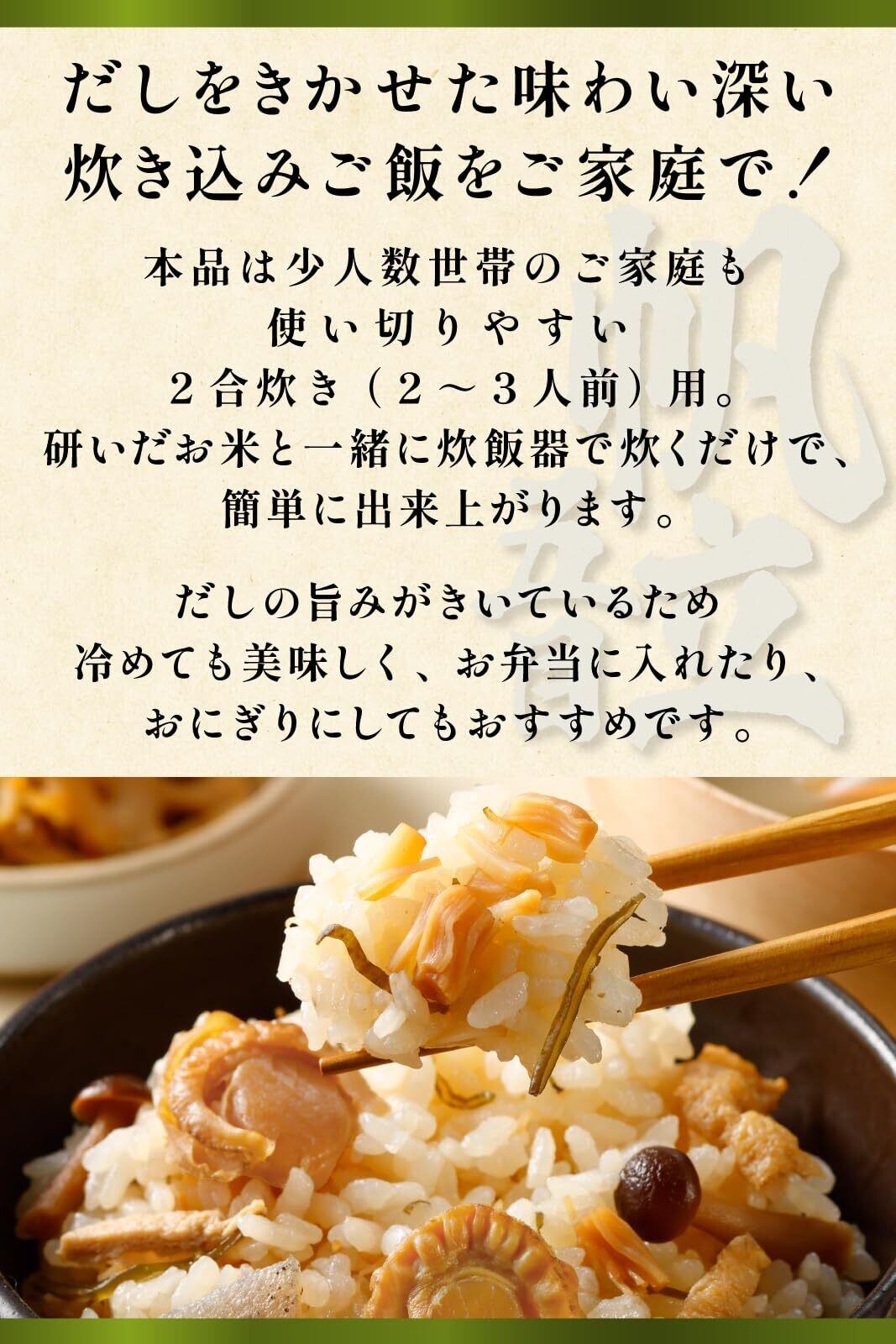 少人数世帯のご家庭も使い切りやすいよう、2合炊き(2~3人前)用。研いだお米とと一緒に炊飯器で炊くだけで、簡単に出来上がります。だしの旨みがきいているため冷めても美味しく、お弁当に入れたり、おにぎりにしてもおすすめです。