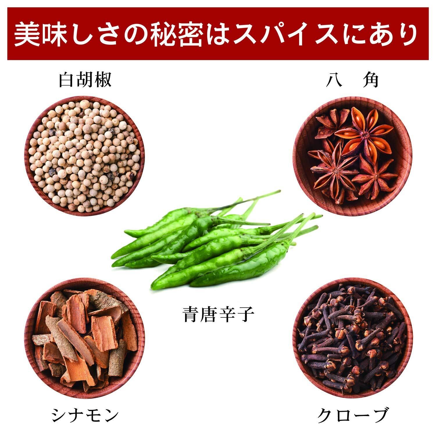原材料:香辛料(白胡椒、シナモン、青唐辛子、八角、セージ、にんにく、しょうが、クローブ、フェンネル)、食塩、糖類(乳糖、グラニュー糖、果糖)、ポークエキス、チキンエキス、調味料(アミノ酸等)、香料、(原材料の一部に小麦を含む)