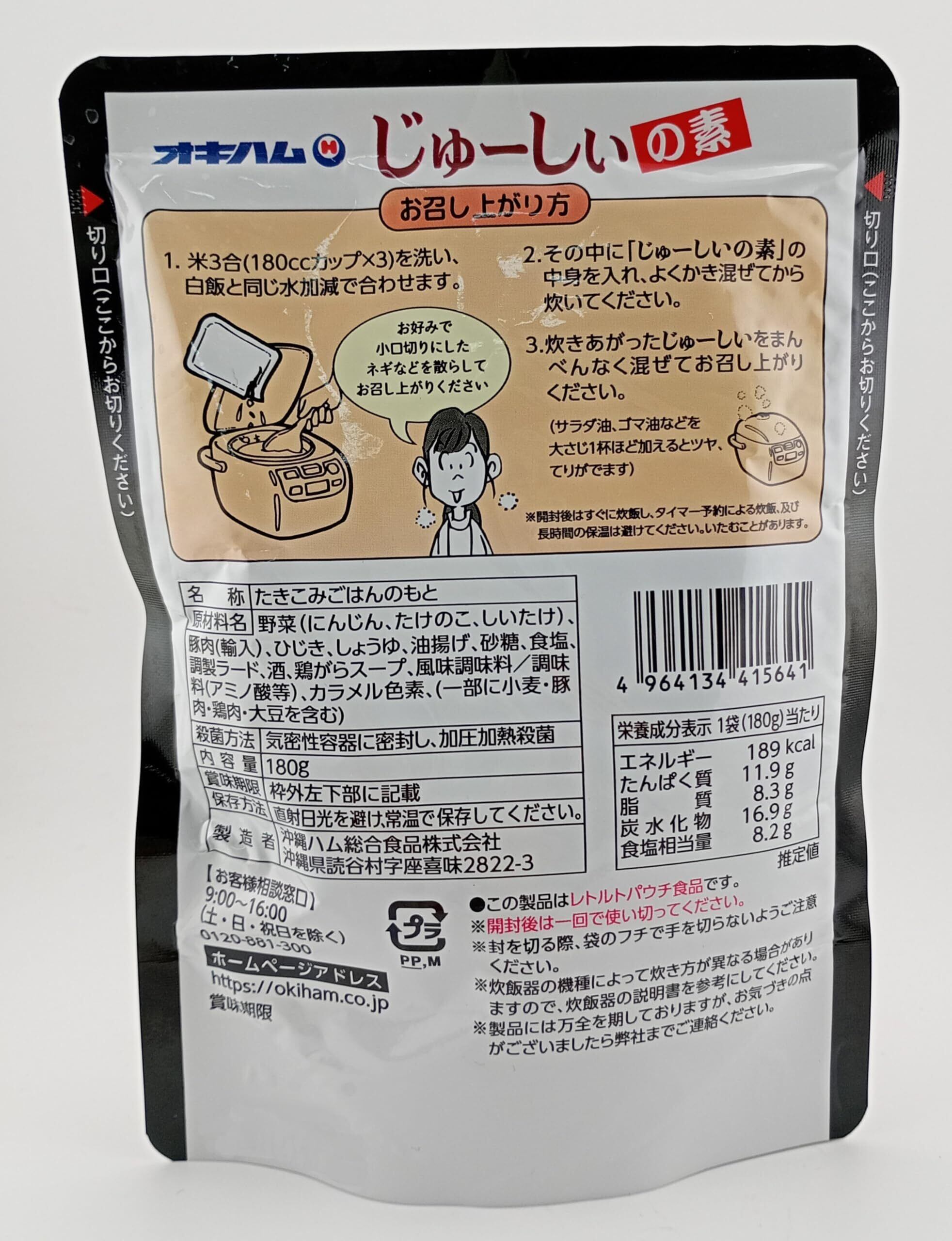 1.米3合を洗い、白飯と同じ水加減で合わせます。2.その中にじゅーしぃの素の中味を入れて、よくかき混ぜてから炊いて下さい。3.炊きあがってから、約10分間蒸らします。
