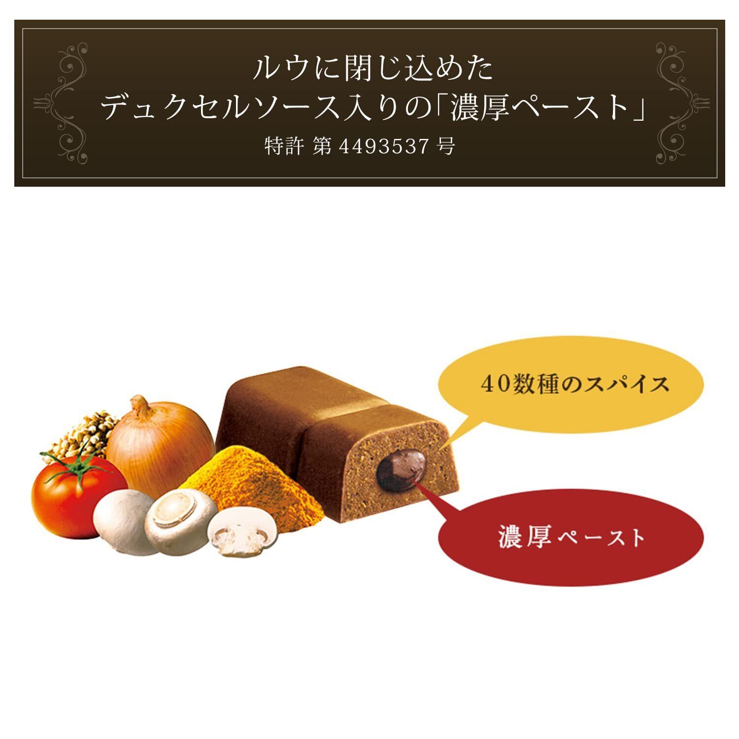 「コクのペースト」を「香りのルウ」の中に閉じ込めた、こだわりの2層タイプのカレールウです。コクのペーストにはデュクセルソース、香りのルウには、40数種のスパイスを配合していますので、濃厚なコクと豊かな香りが味わえます。スパイスの中でも、ガーリックとガラムマサラを強めて、華やかでバランスのとれた味わいに仕上げました。