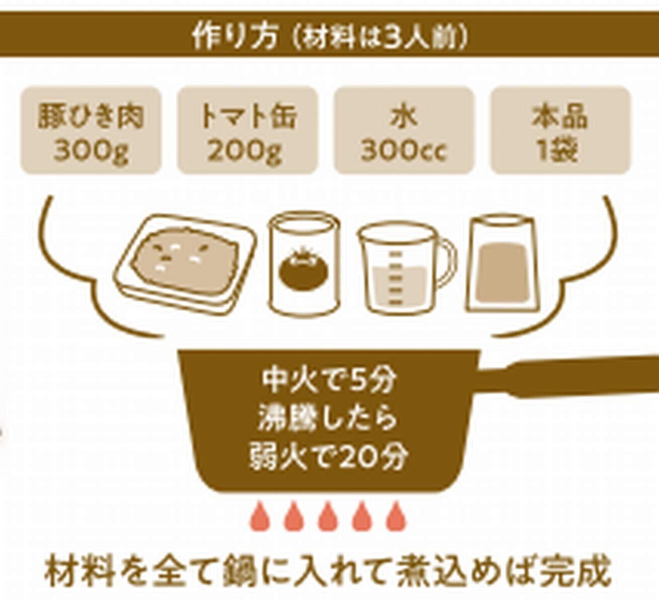 【作り方】豚ひき肉(300g)、トマト缶(200g)、水300cc、スパイスカレーの素1袋を鍋に入れて中火で5分、弱火で20分煮込むだけで失敗なく美味しいスパイスカレーが完成。