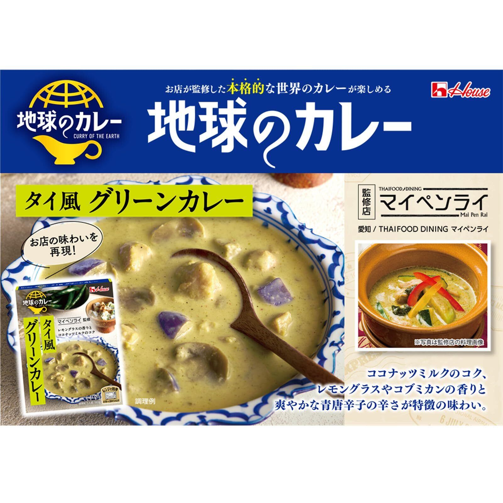 (グリーンカレー)ココナッツミルクのコク、レモングラスやコブミカンの香りと爽やかな唐辛子の辛さが特徴の味わい。マイペンライ監修。レモングラス、コブミカンはタイカレーペーストに含まれる原料です。(バターチキンカレー)生クリームとバターのコク深さ、ガーリックの香りと完熟トマトの甘みが特徴の味わい。アチャカナ監修。(海老カレー)海老の甘みと旨み、コリアンダーとマスタードシードの香りとトマトの爽やかな酸味が特徴の味わい。Cini CURRY監修。(ポークビンダルー)ビネガーの酸味と玉ねぎの旨み、クローブとカルダモンの香りとリンゴの甘みが特徴の味わい。spice curry mokuromi監修。(チキンカレー)チキンと生姜の旨み、塩味と油の旨みでクセになる美味しさとトマトの爽やかな酸味が特徴の味わい。カラバトカリー監修。