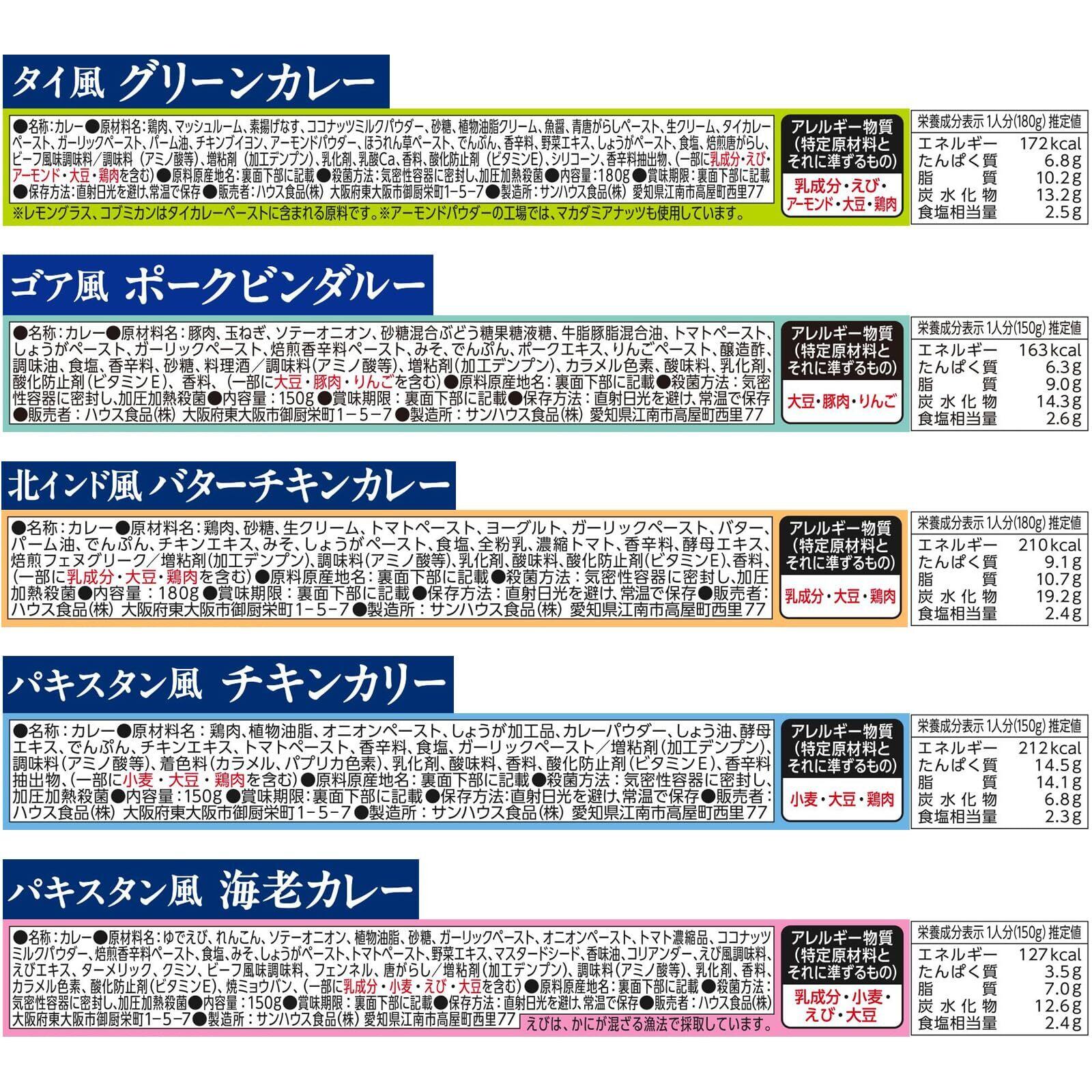 (グリーンカレー)鶏肉、マッシュルーム、素揚げなす、ココナッツミルクパウダー、砂糖、植物油脂クリーム、魚醤、青唐がらしペースト、生クリーム、タイカレーペースト、ガーリックペースト、パーム油、チキンブイヨン、アーモンドパウダー、ほうれん草ペースト、でんぷん、香辛料、野菜エキス、しょうがペースト、食塩、焙煎唐がらし、ビーフ風味調味料/調味料(アミノ酸等)、増粘剤(加工デンプン)、乳化剤、乳酸Ca、香料、酸化防止剤(ビタミンE)、シリコーン、香辛料抽出物、(一部に乳成分・えび・アーモンド・大豆・鶏肉を含む)(バターチキンカレー)鶏肉、砂糖、生クリーム、トマトペースト、ヨーグルト、ガーリックペースト、バター、パーム油、でんぷん、チキンエキス、みそ、しょうがペースト、食塩、全粉乳、濃縮トマト、香辛料、酵母エキス、焙煎フェヌグリーク/増粘剤(加工デンプン)、調味料(アミノ酸等)、乳化剤、酸味料、酸化防止剤(ビタミンE)、香料、(一部に乳成分・大豆・鶏肉を含む)(海老カレー)ゆでえび、れんこん、ソテーオニオン、植物油脂、砂糖、ガーリックペースト、オニオンペースト、トマト濃縮品、ココナッツミルクパウダー、焙煎香辛料ペースト、食塩、みそ、しょうがペースト、トマトペースト、野菜エキス、マスタードシード、香味油、コリアンダー、えび風調味料、えびエキス、ターメリック、クミン、ビーフ風味調味料、フェンネル、唐がらし/増粘剤(加工デンプン)、調味料(アミノ酸等)、乳化剤、香料、カラメル色素、酸化防止剤(ビタミンE)、焼ミョウバン、(一部に乳成分・小麦・えび・大豆を含む)(ポークビンダルーカレー)豚肉、玉ねぎ、ソテーオニオン、砂糖混合ぶどう糖果糖液糖、牛脂豚脂混合油、トマトペースト、しょうがペースト、ガーリックペースト、焙煎香辛料ペースト、みそ、でんぷん、ポークエキス、りんごペースト、醸造酢、調味油、食塩、香辛料、砂糖、料理酒/調味料(アミノ酸等)、増粘剤(加工デンプン)、カラメル色素、酸味料、乳化剤、酸化防止剤(ビタミンE)、香料、(一部に大豆・豚肉・りんごを含む)