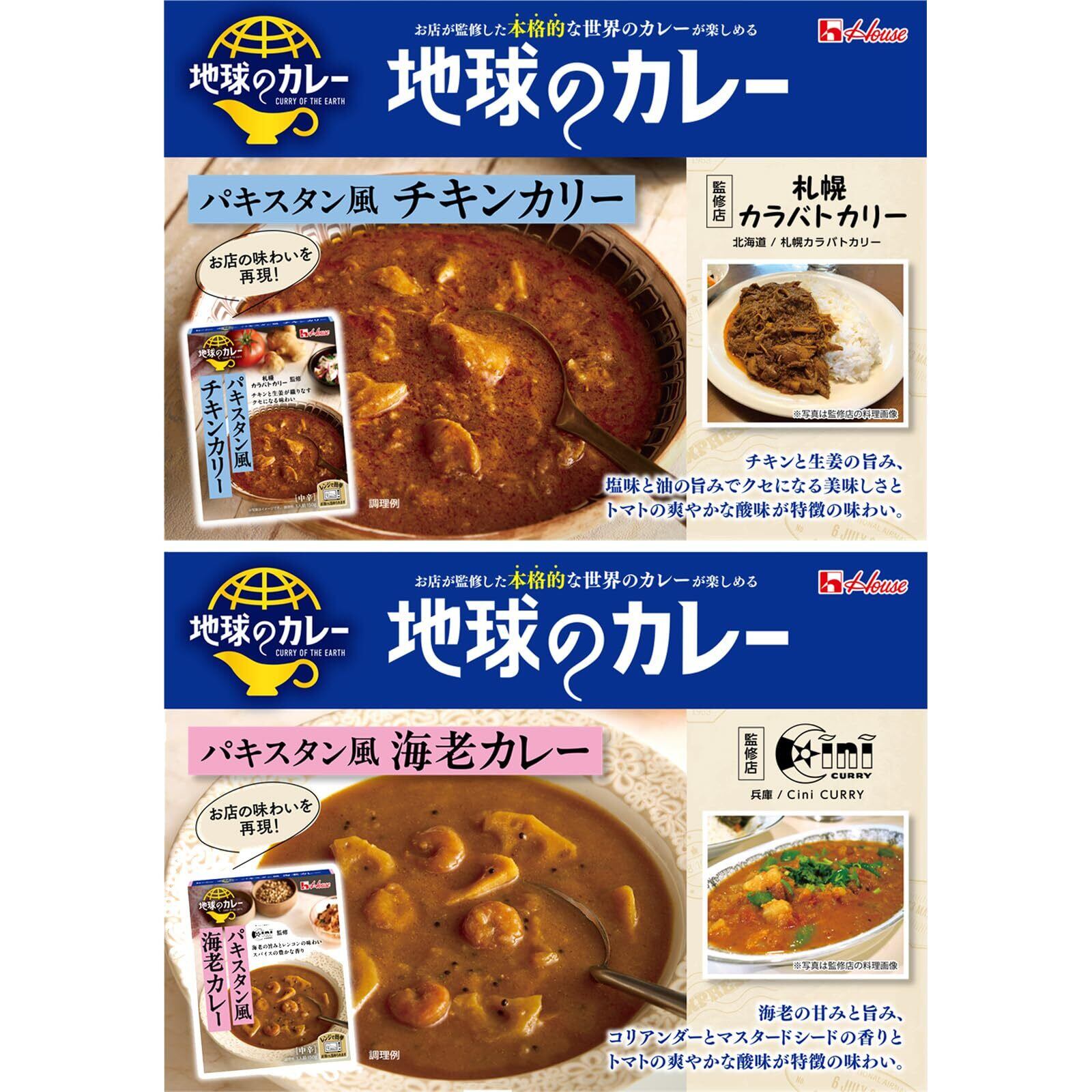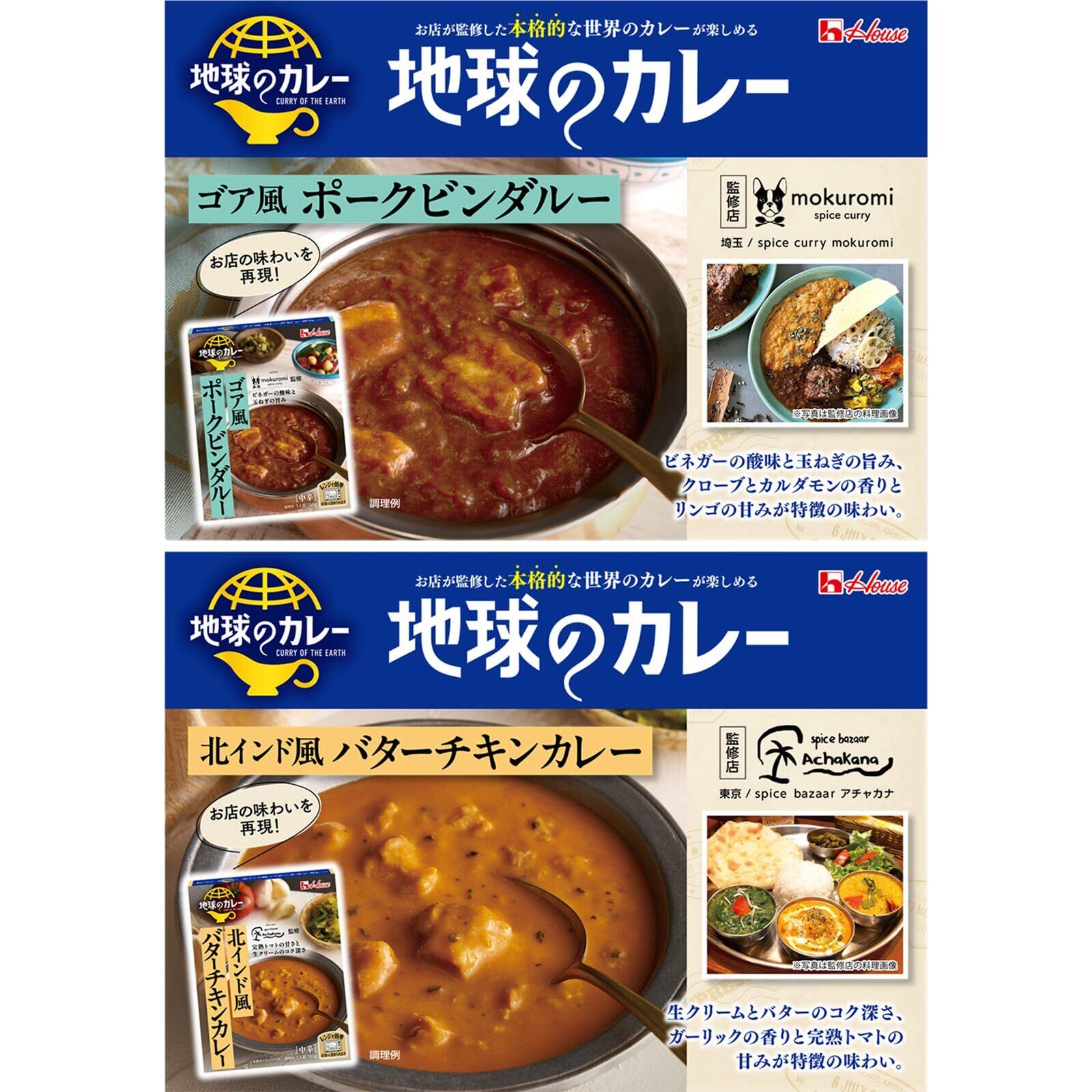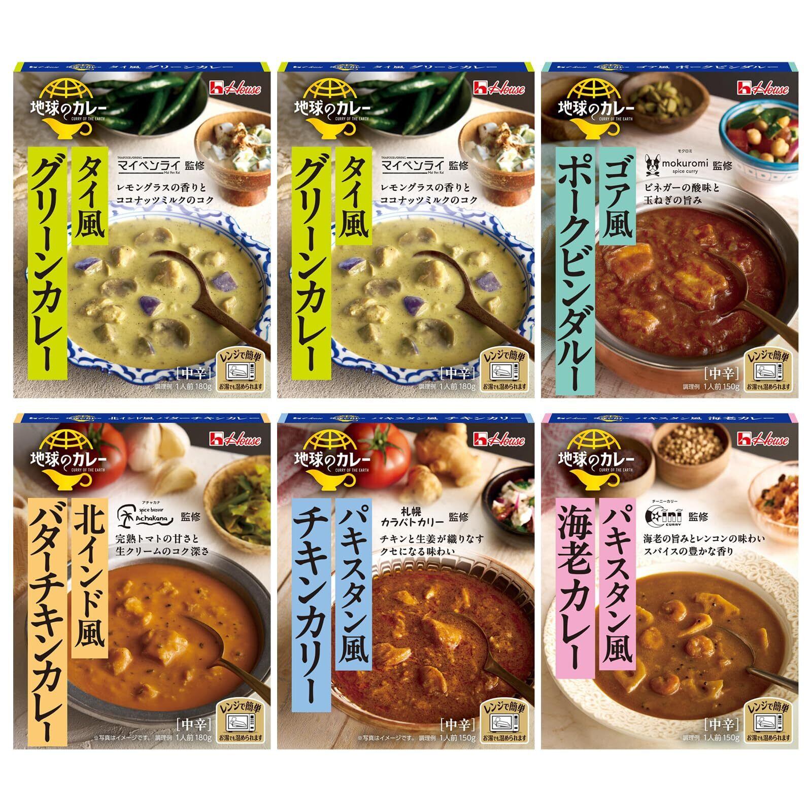 ハウス地球のカレー5種6食アソートセット(グリーン/バターチキン/海老・ポークビンダルー/チキン)【レンジ調理対応】【レトルト食品】【非常食】【エスニック】【セット買い】