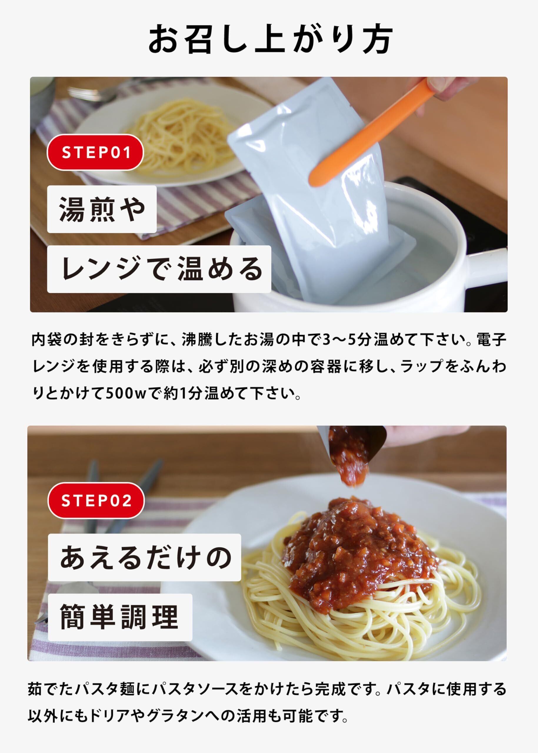 【湯せんの場合】沸騰したお湯に3分~5分 ①内袋の封を切らずに沸騰したお湯の中で3~5分間温めます。②加熱後、ゆでたてのスパゲティ(乾麺で100gが目安)にかけてください。【電子レンジの場合】500W約1分20秒、600W約1分10秒 ①内袋の封を切り、必ず深めの耐熱容器に移し、ラップをふんわりとかけて温めます。②加熱後、ゆでたてのスパゲティ(乾麺で100gが目安)にかけてください。