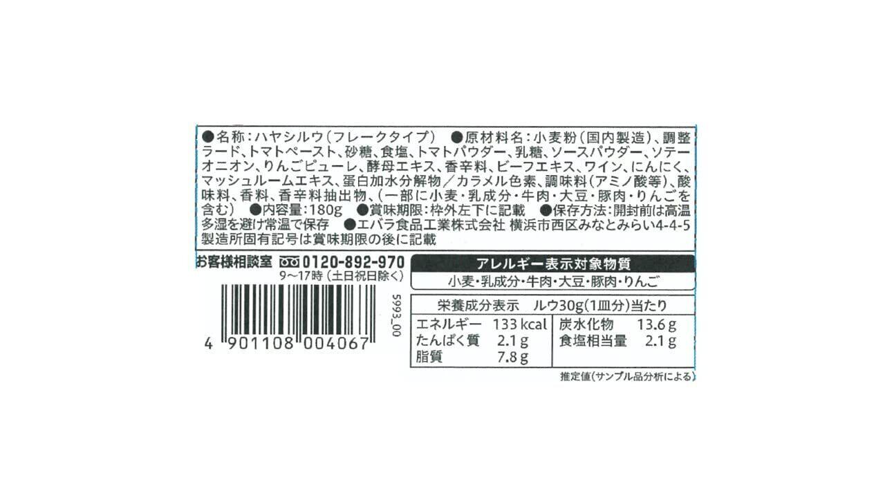 【原材料】小麦粉(国内製造)、調整ラード、トマトペースト、砂糖、食塩、トマトパウダー、乳糖、ソースパウダー、ソテーオニオン、りんごピューレ、酵母エキス、香辛料、ビーフエキス、ワイン、にんにく、マッシュルームエキス、蛋白加水分解物/カラメル色素、調味料(アミノ酸等)、酸味料、香料、香辛料抽出物、(一部に小麦・乳成分・牛肉・大豆・豚肉・りんごを含む)【栄養成分】ルウ30g(1皿分)当たりエネルギー(kcal)133、たんぱく質(g)2.1、脂質(g)7.8、炭水化物(g)13.6、食塩相当量(g)2.1【アレルゲン】小麦、乳成分、牛肉、大豆、豚肉、りんご