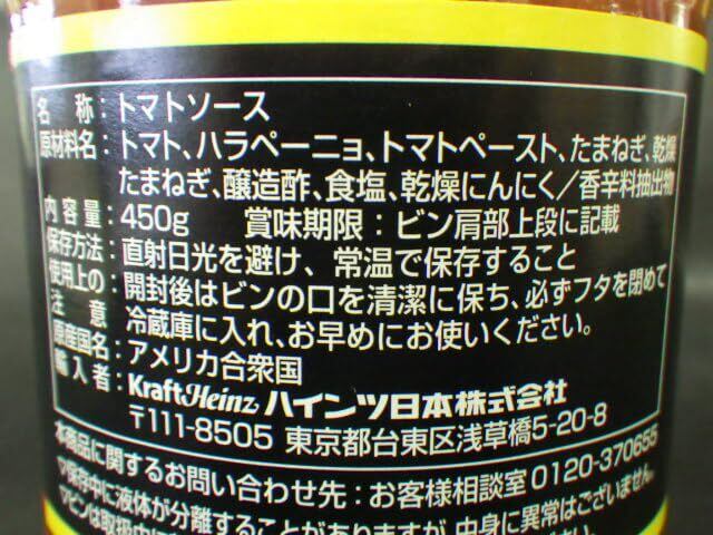 トマト、ハラペーニョ、トマトペースト、たまねぎ、醸造酢、乾燥たまねぎ、食塩、乾燥にんにく、香辛料抽出物、水