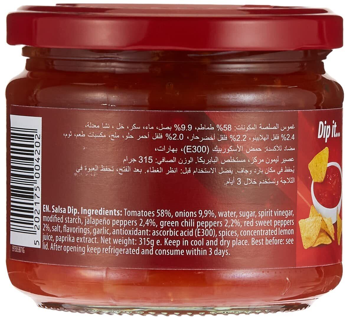 原材料:トマト、たまねぎ、砂糖、醸造酢、ハラペーニョ、青唐辛子、赤ピーマン、食塩、にんにく、クミン、カイエンペッパー、濃縮レモン果汁、増粘剤(加工でんぷん)、香料、酸化防止剤(V.C)、パプリカ色素