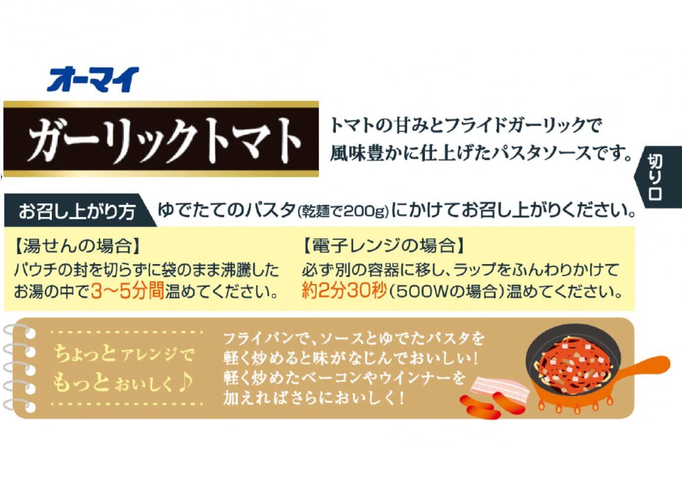 具材感のあるイタリア産完熟トマトにフライドガーリックを加えて作ったしっかりした味わいのパスタソースです。