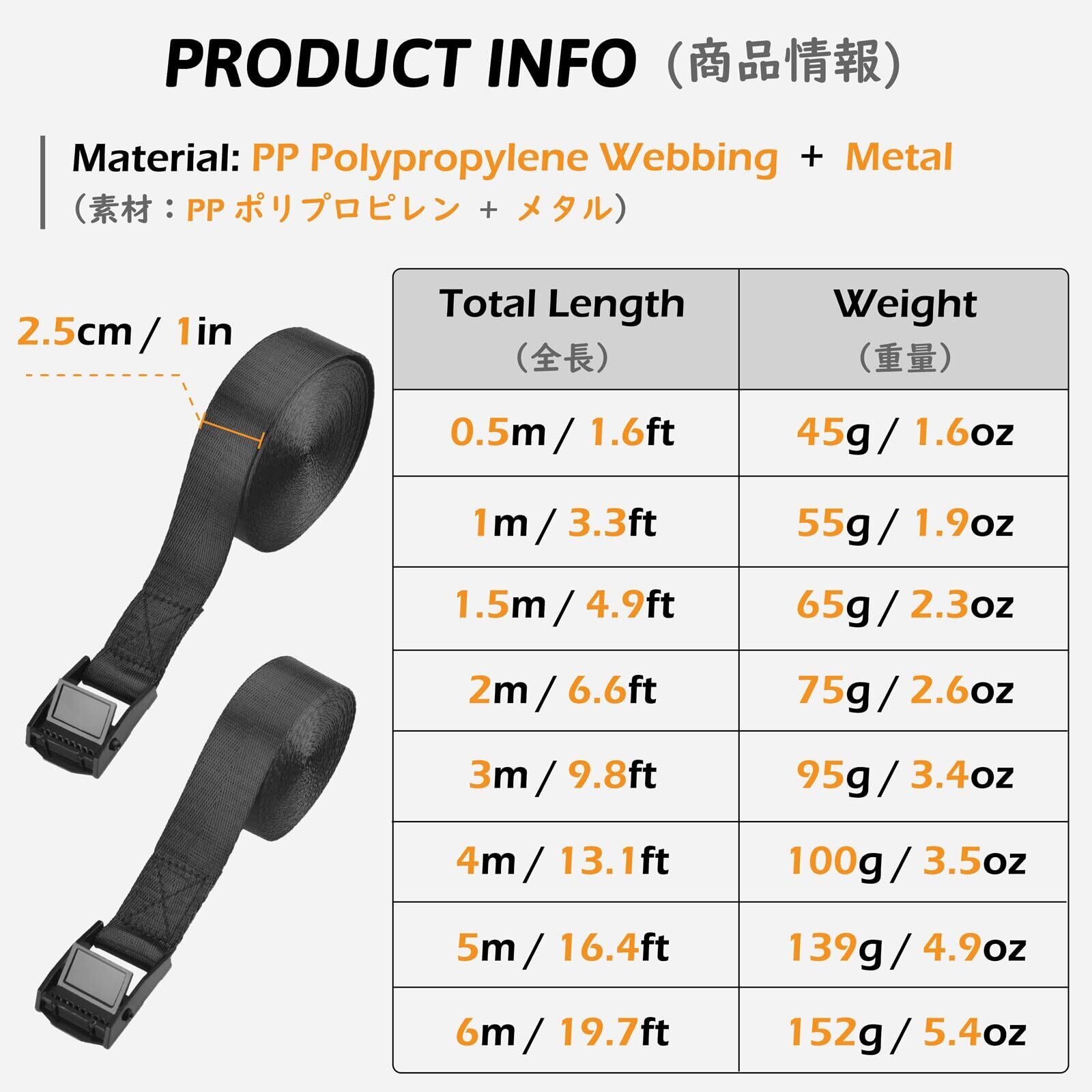 【仕様 】材質:ベルト/ポリプロピレン、カムバックル/亜鉛合金 幅:25mm 長さ:1m/1.5m/2m/3m/5m 4本セット