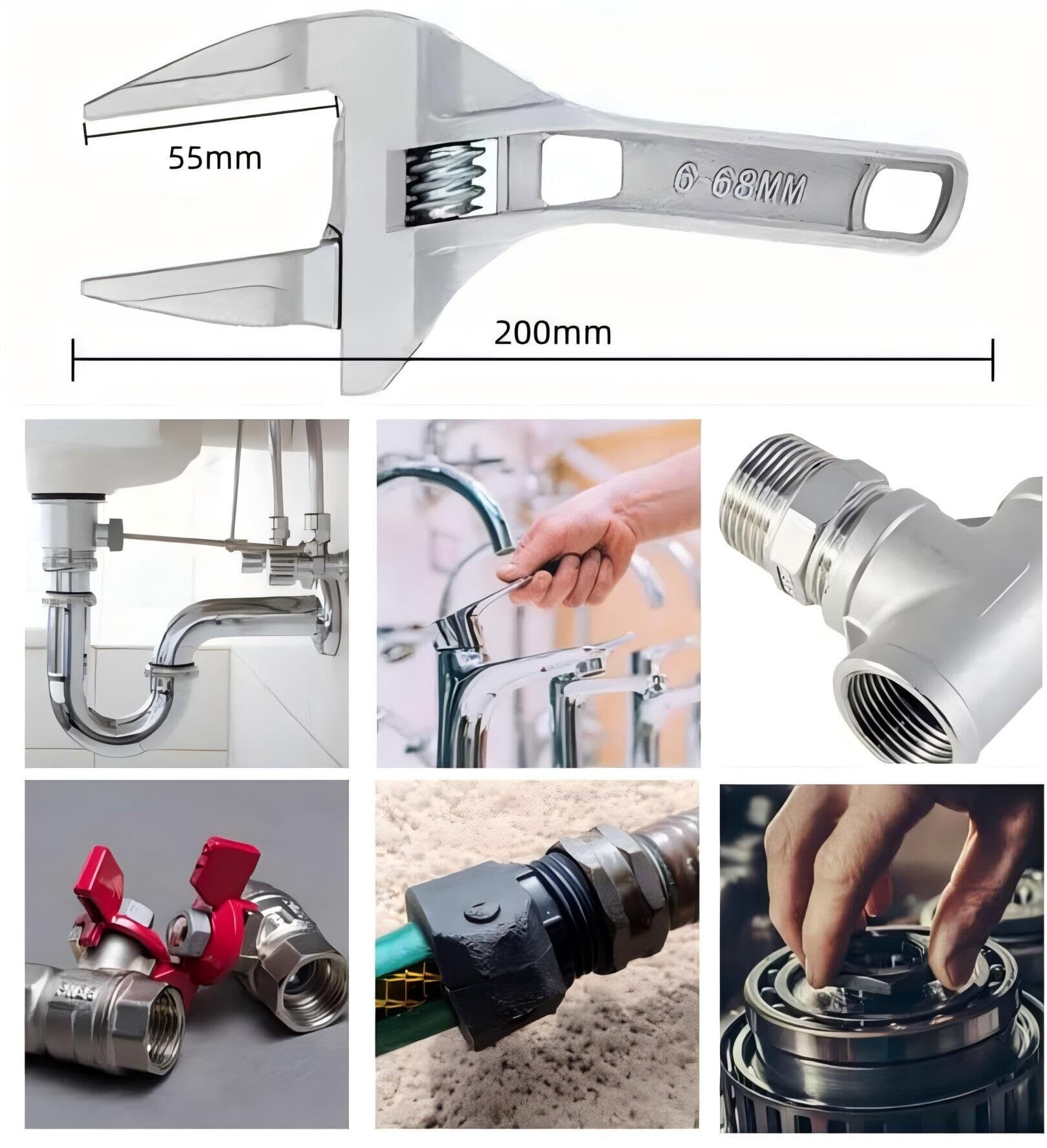 【製品寸法】全長:200 mm。口開き寸法: 6〜68mm。口奥行き:55mm、厚さ:10mm。合理的なアスペクト比により、狭い場所でも簡単に作業できます。