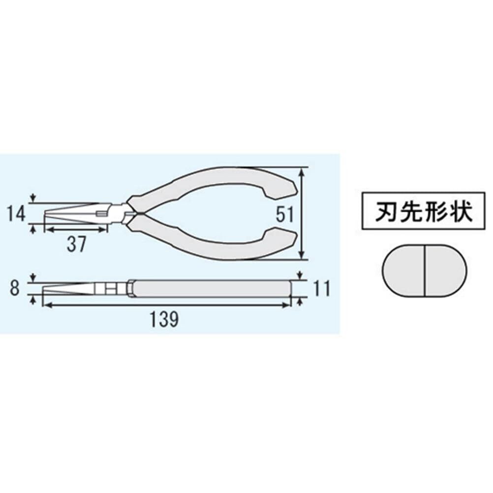 精密作業に適したニードルノーズタイプです。先端の内側はギザ付で、細かなチップやパーツも滑らずしっかりと保持します。グリップは環境に優しいエラストマーを使用し、手によくフィットするとデザイングリップです。静電気(ESD)対策を施しています。 (表面抵抗値 :1×10 (6乗)~10 (7乗) Ω)※絶縁工具ではありません。【用途】細かい部分の作業、銅線や細かい針金の曲げ、切断、精密細工に。【サイズ】本体:139×51×11mm/先端長:37mm/先端幅:13mm/先端厚さ:8mm【重量】68g【切断能力】銅線:φ2mm 【刃部硬度】HRC58±4 【材質】高炭素鋼 より ●先端の内側はギザ付で、細やかなチップやパーツも滑らずしっかりとホールドできる ●本体は入念な焼入れにより耐急性に優れている ●手に優しいエラストマーグリップを採用 ●静電気対策を施したESD対応グリップ採用。(表面抵抗値:1×106~107Ω)