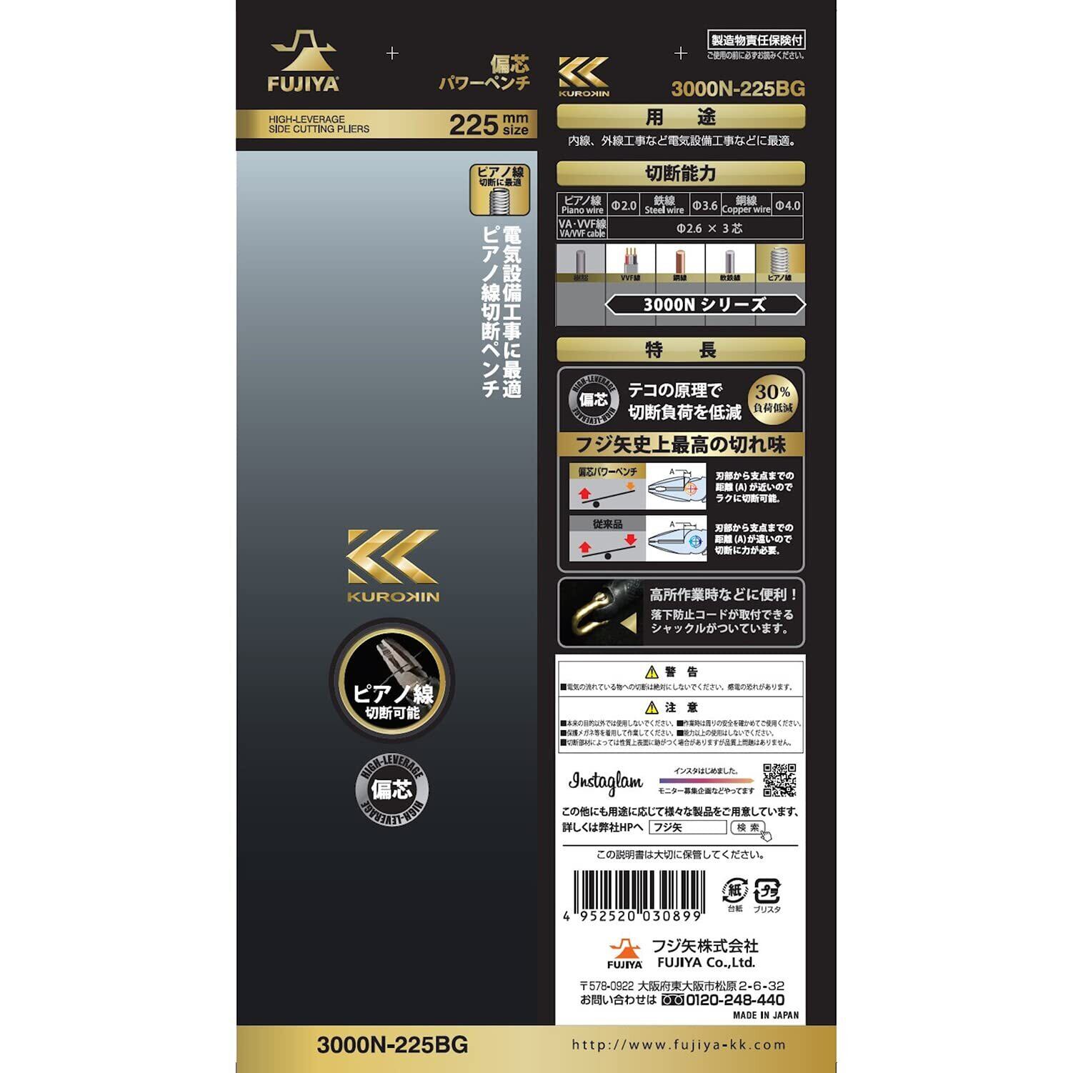 フジ矢(Fujiya) 偏芯パワーペンチ(黒金・シャックル付)225㎜ 偏芯テコでらくらく切断 3000N-225BG