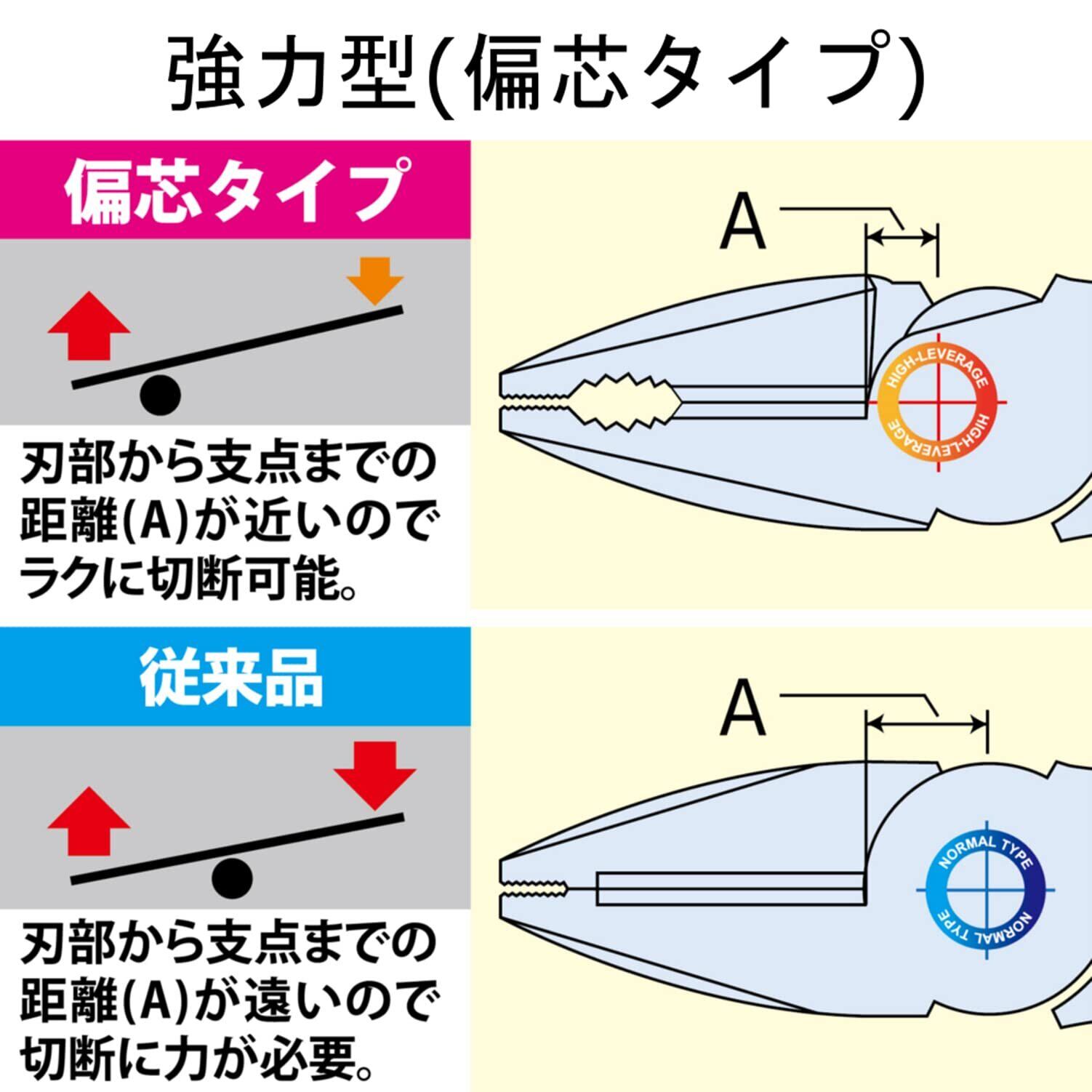 偏芯テコ機能で従来製品よりも軽く切断出来ます。