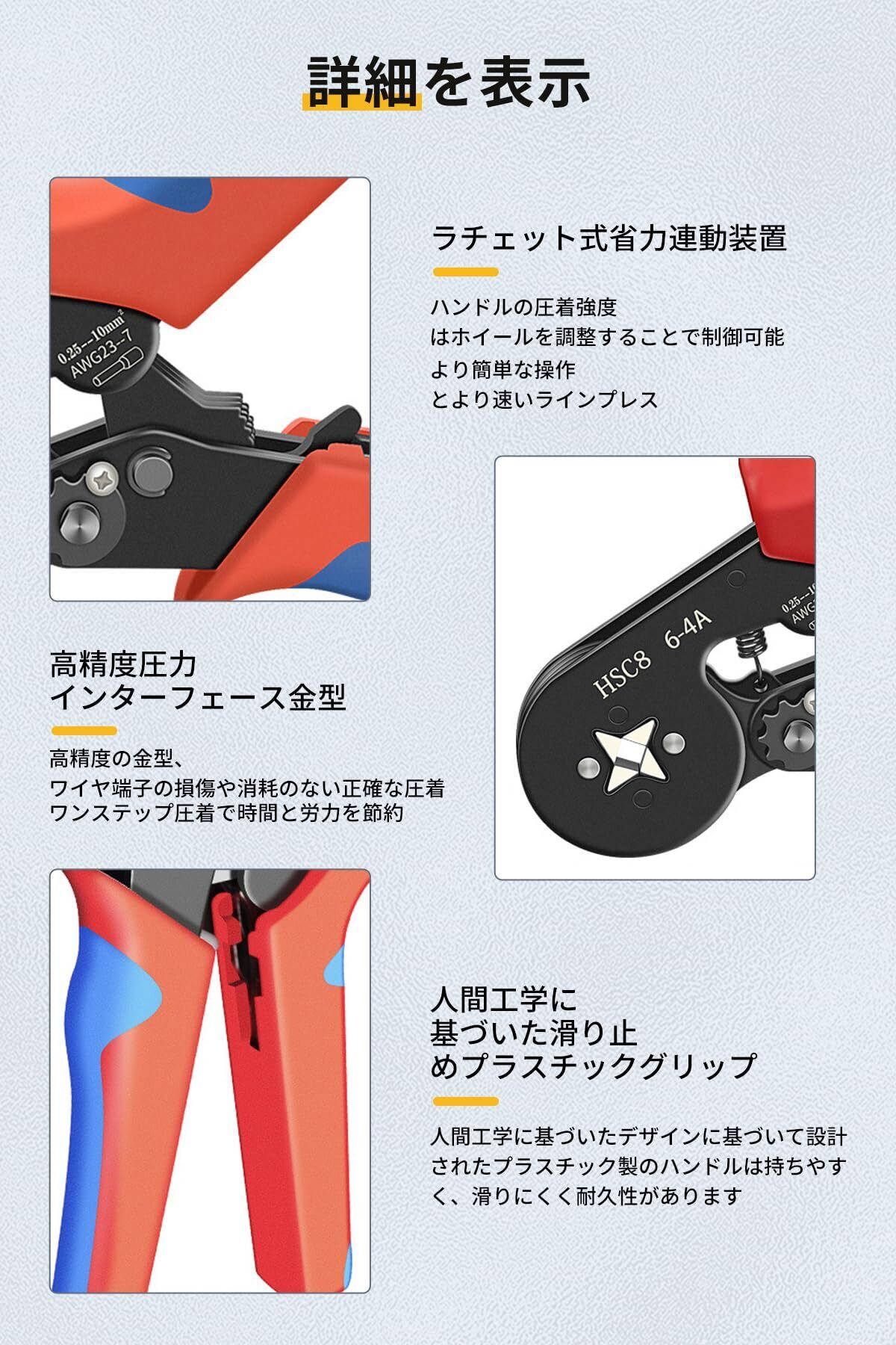 【作業効率向上】フェルール圧着工具はラチェット構造を採用し、ハンドルはダイヤルを調整することで圧着力を調整できます。正しい直径に自動的に適応し、わずかな力で圧着端子を剥がすことができるため、精度と信頼性が効果的に向上し、端子セットの無駄がなくなります。握力に自信のない方でも使用できるスプリングロック付です。操作が簡単で作業が楽になり、体力の消耗も少なく効果的に圧着できます。
