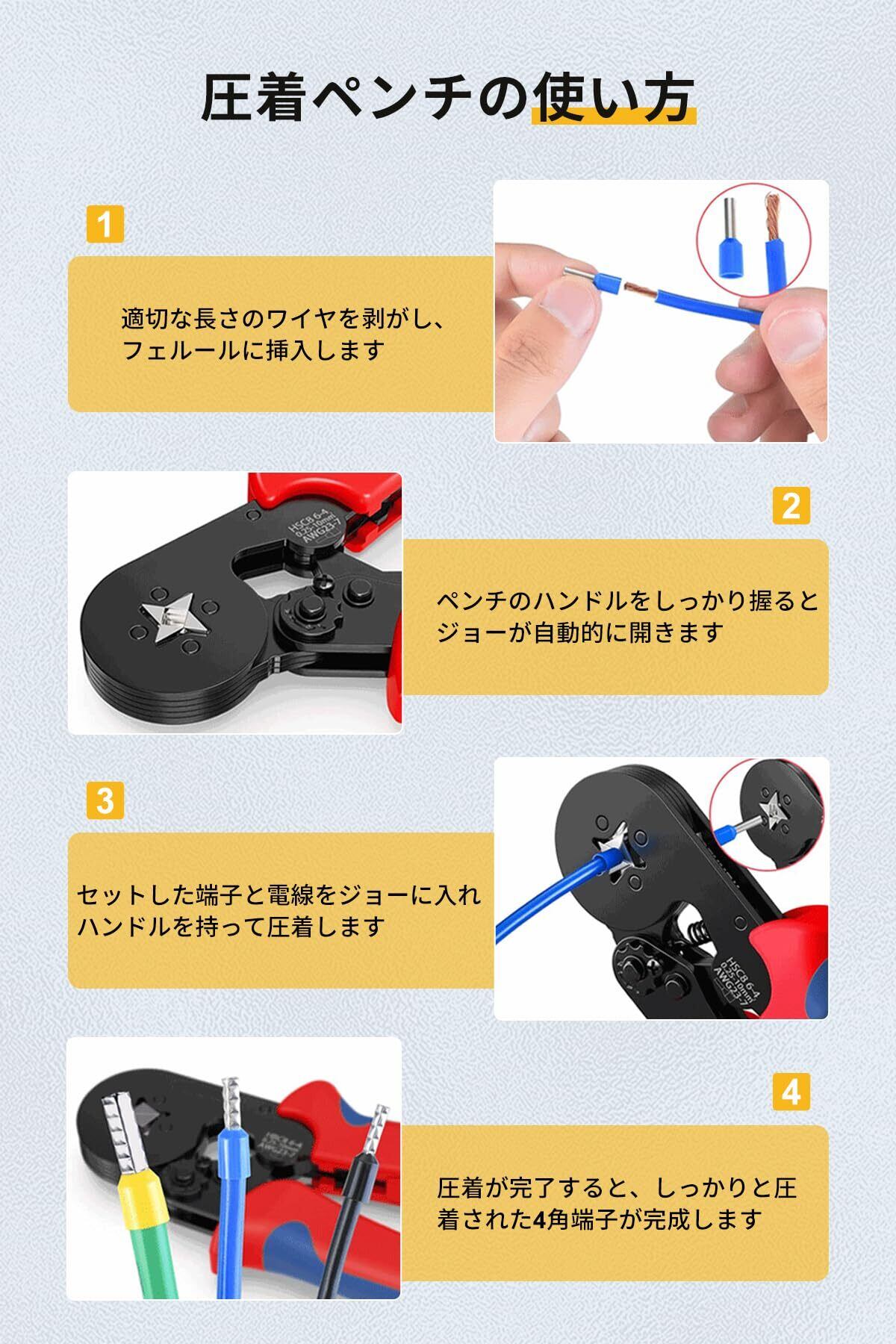 【使用範囲】フェルール端子圧着工具キットは電気工事や電気付属品に幅広く使用できます。自動車やバイク、家庭などのさまざまな機器のスイッチやバッテリー、電子部品のピンなどの端子を素早く圧着するのに大活躍します。