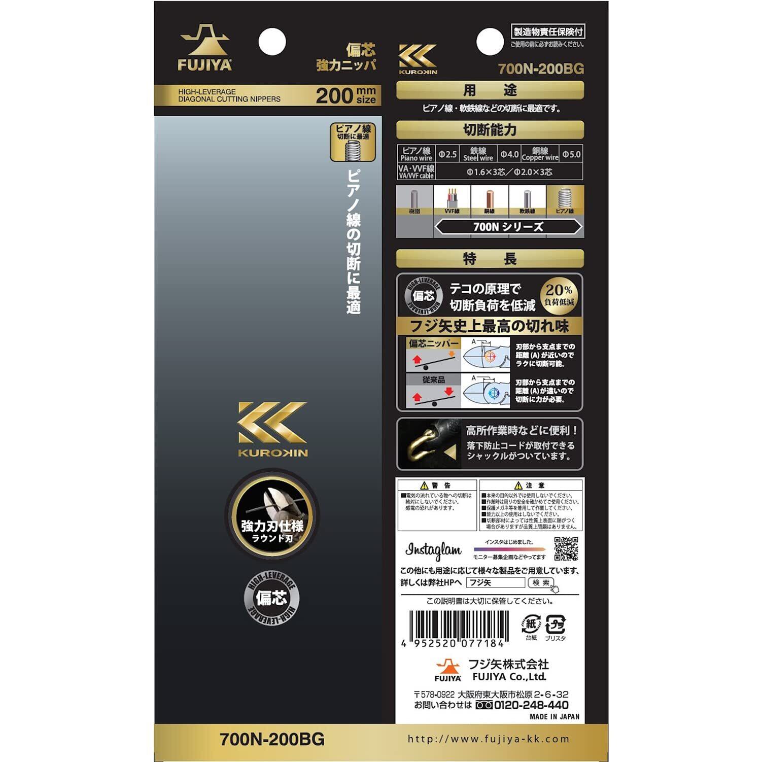 フジ矢(Fujiya) 偏芯強力ニッパ(黒金・シャックル付)200㎜ 偏芯テコでらくらく切断 700N-200BG