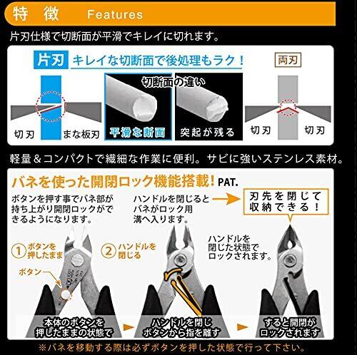 極薄刃ニッパー 片刃 仕上り良く、作業効率アップに。 片刃仕様により切断面が平滑でキレイな仕上りに。後処理を省き、作業時間を大幅カット。 バネを使った開閉ロック機構搭載。刃先を閉じた状態で収納できる。 サビに強いステンレス素材。