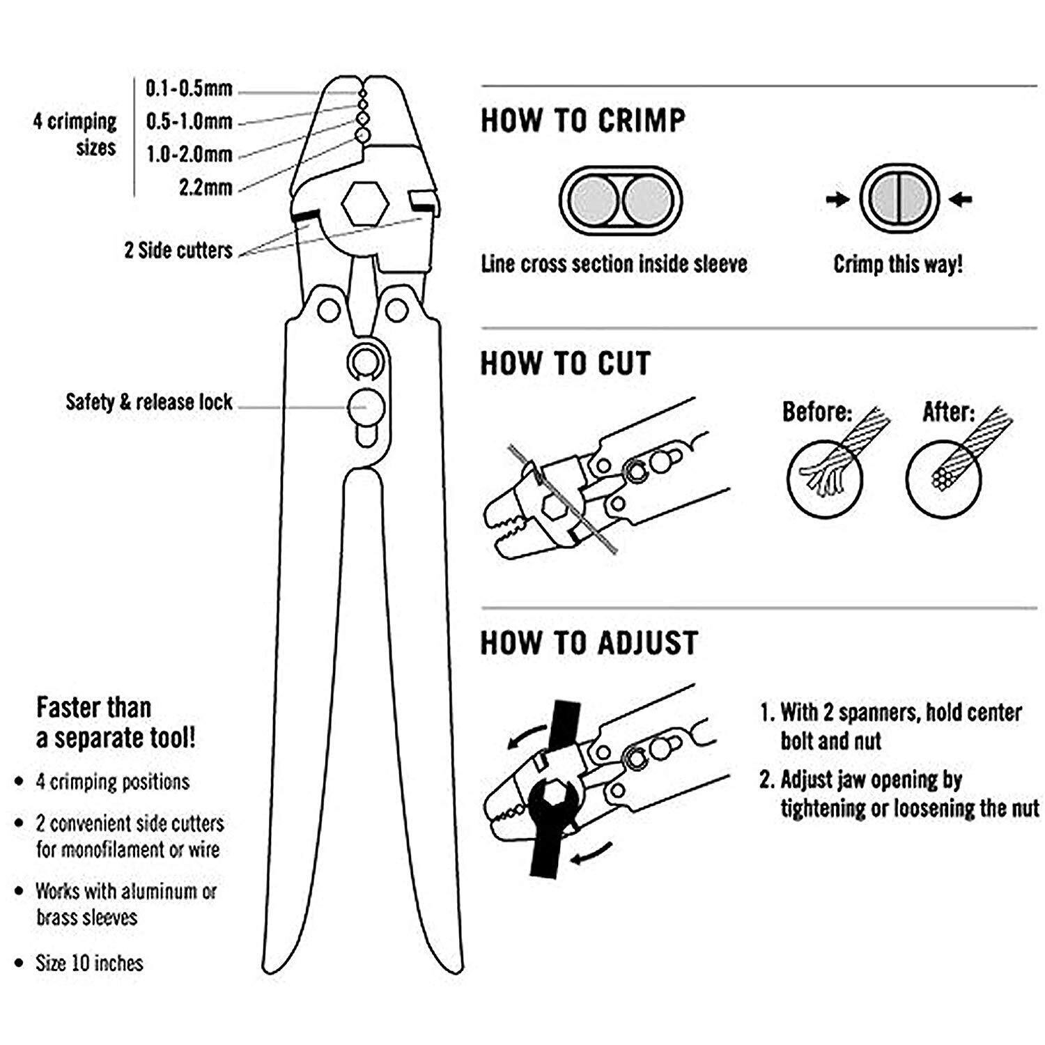 特徴:①トグル機構採用で単位ストロークあたりの所要握力を軽減。②ワイヤーロープカッター機能付き。