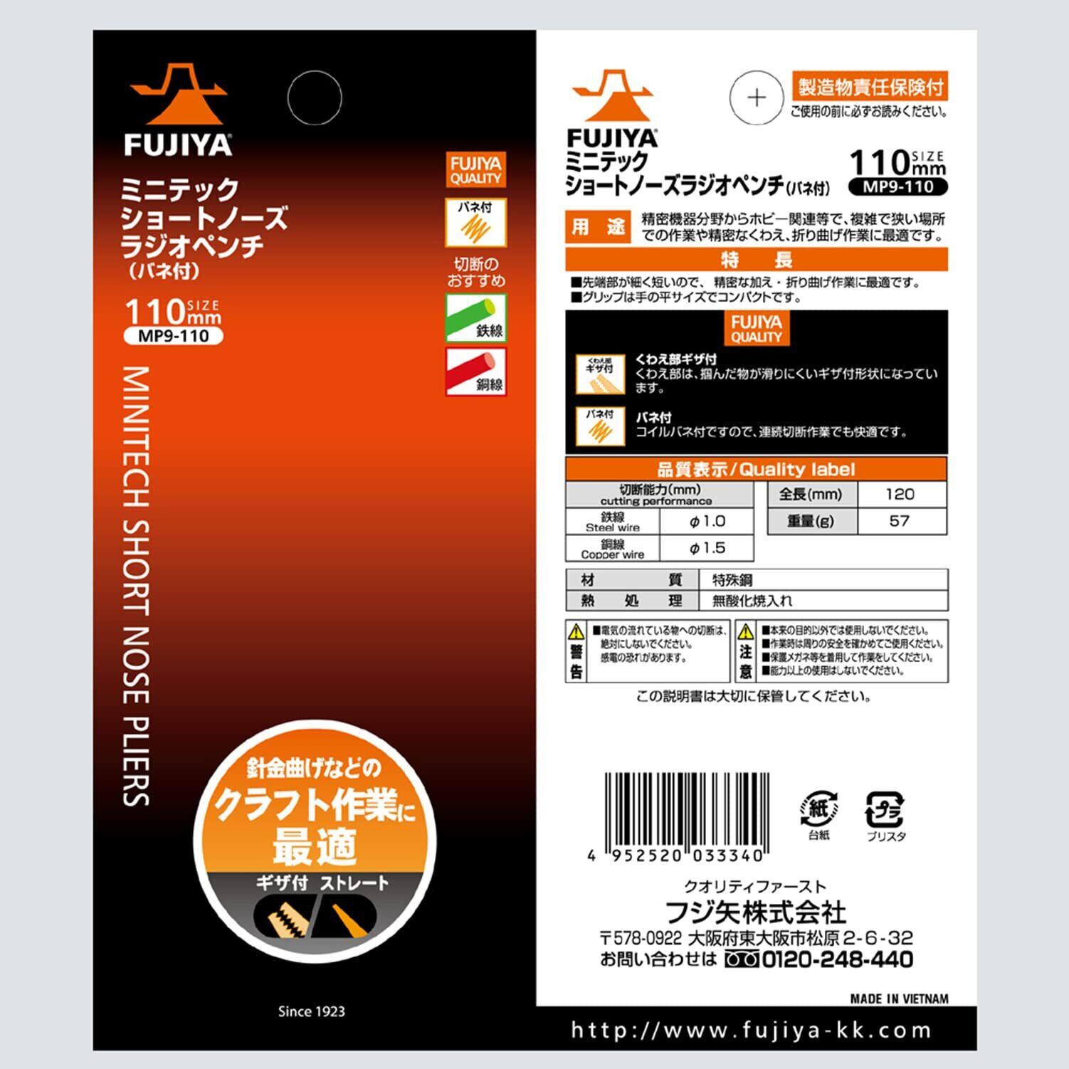 フジ矢(Fujiya) ショートノーズラジオペンチ 小型・先端極細仕様 (バネ付) 110mm MP9-110