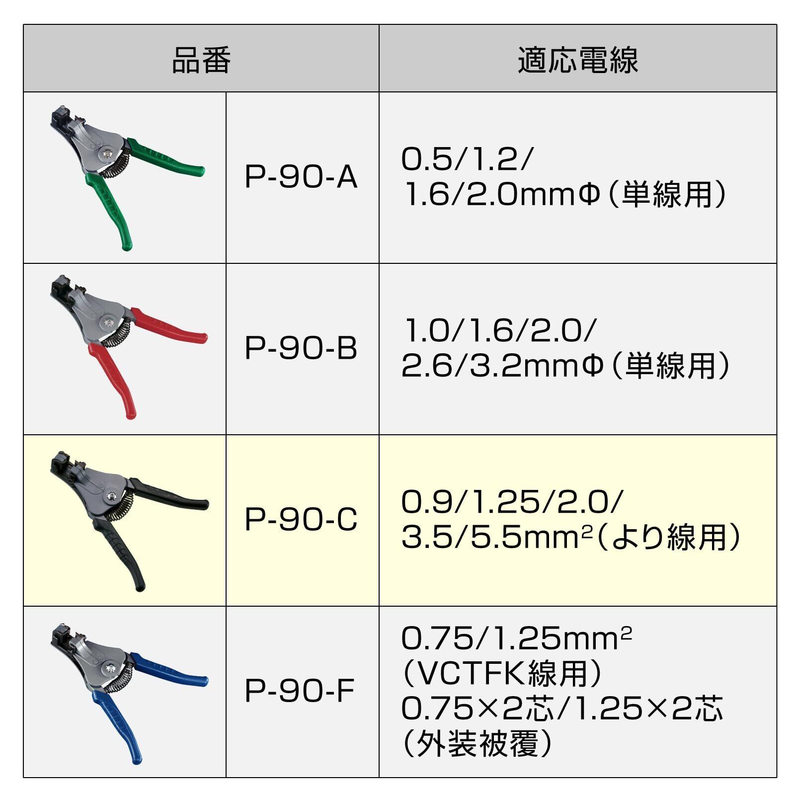 ・【適応電線】より線用:0.9/1.25/2.0/3.5/5.5mm^2【全長】165mm【重量】350g【ハンドル色】黒【付属品】P-918 ストリップゲージ ※取り付けには対辺2.5mmの六角レンチが必要です。【用途】電気工事、配線工事、電気回路、配線作業、電子工作