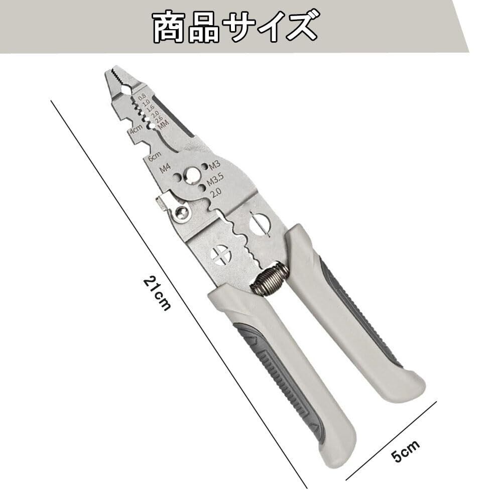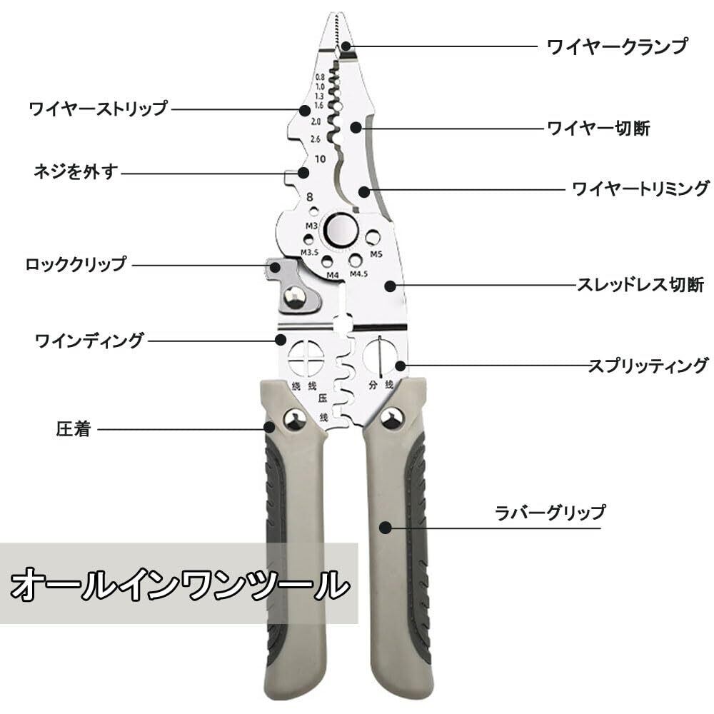 【オールインワンツール】このワイヤーツールは、手に持つミニツールボックスのようなもので、ネジ、釘、鉄棒の締め付けや切断に加えて、ワイヤーストリッピング、ワイヤーカット、圧着、ワイヤー巻き取り、切断、分割、ワイヤークランプにはネジを外すレンチ機能も付いています。ワイヤーストリッパーと圧着工具を使用すると、複数のツールを使用せずに複数のタスクを処理できるため、時間が節約され、生産性が向上します。