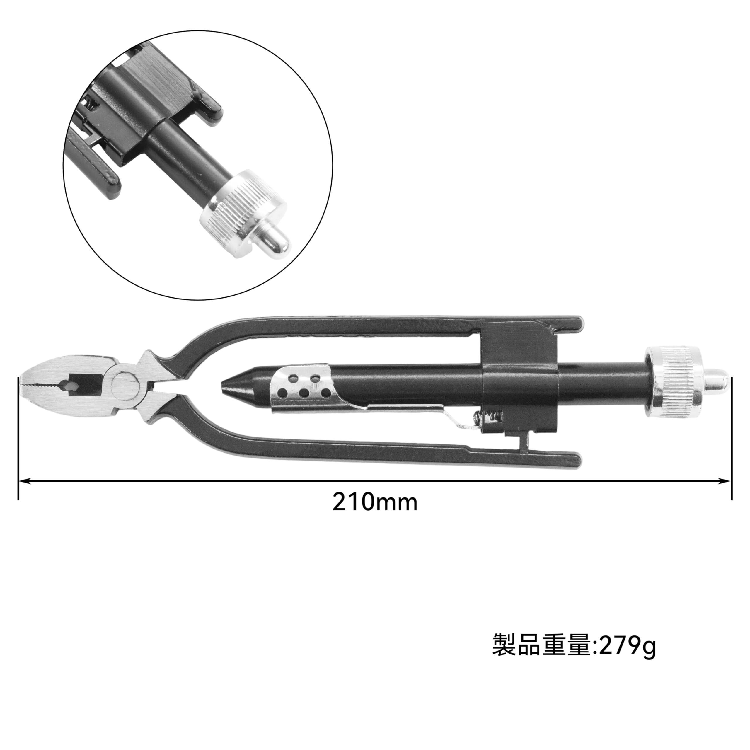 【ワイヤーツイスターの商品仕様】:全長:210mm 重さ:279g 機能:オートリターン式。熱処理加工により硬度が向上し、航空産業でも使用可能なレベルの頑丈さを実現しています。