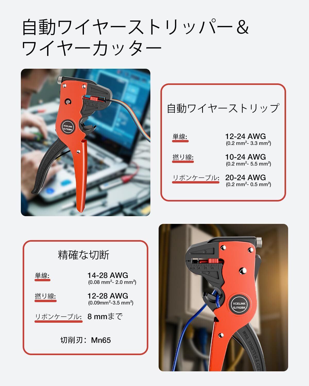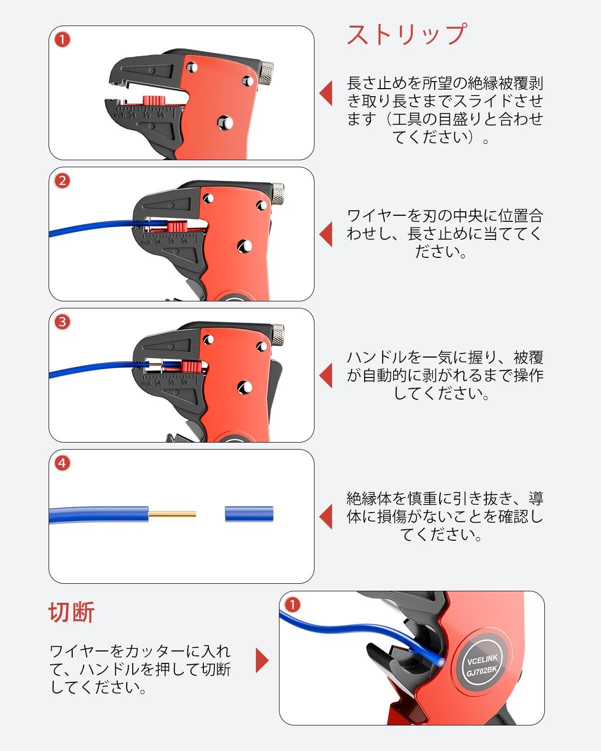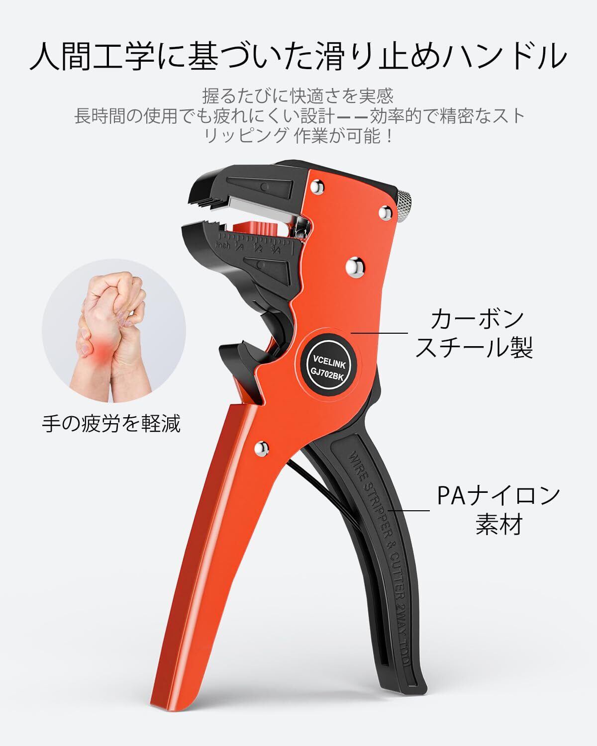VCELINK GJ702BK 自動ワイヤーストリッパー & カッター 10〜24 AWG(0.2mm²-5.5mm²) 被覆剥き ワイヤー切断 寸法調整可能 高精度 単線 撚り線用 黒+赤