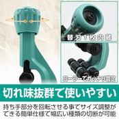 ローラー式のパイプカッターはフレキ管・トイレの止水栓・ロータンクの接続・配管の修理作業にご活用いただけます。調整ダイヤルの内部に替え刃を収納しているため「切れ味が悪いかな」と思った時にサッと交換可能です。