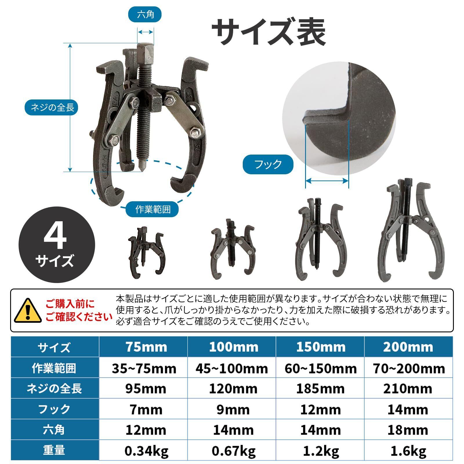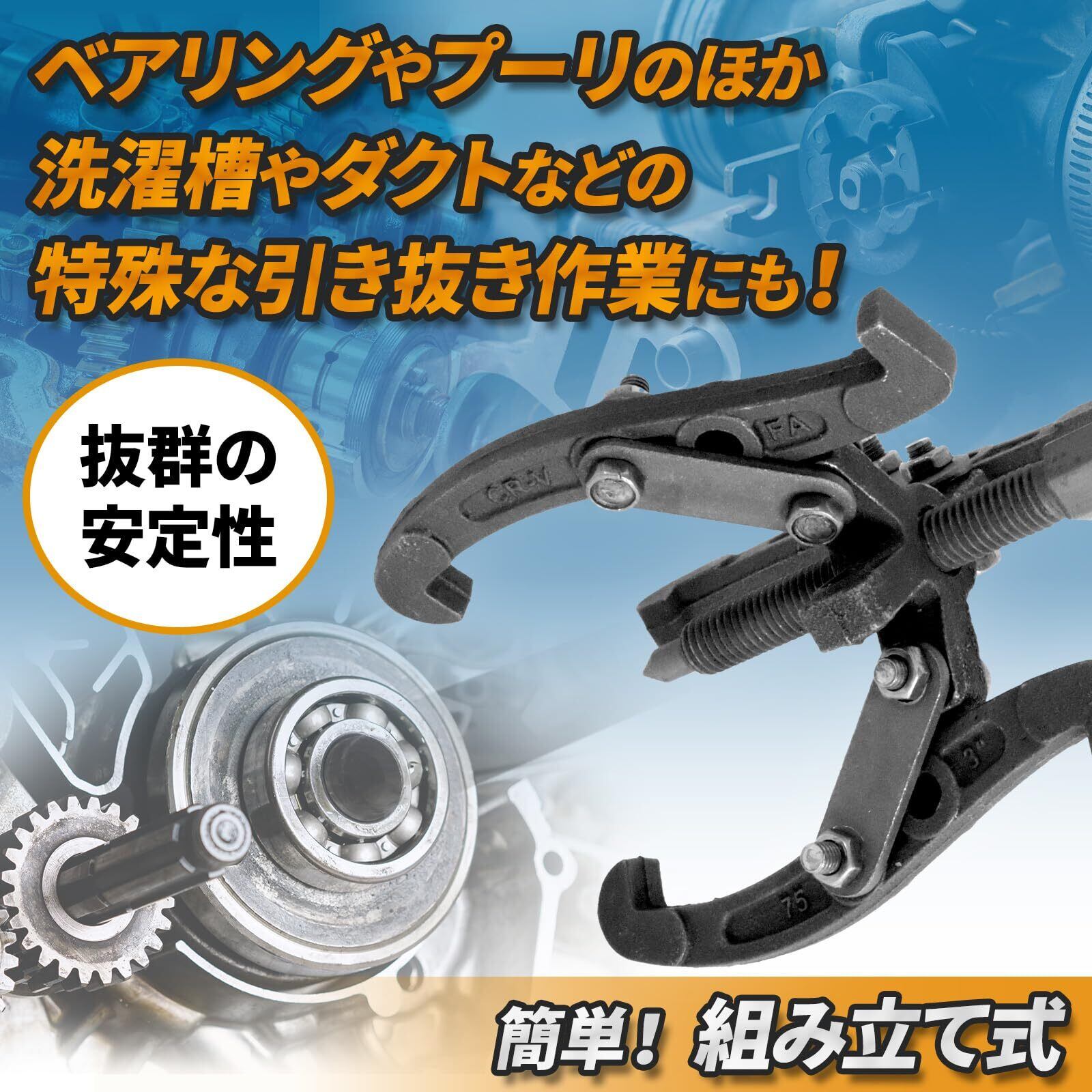ギアプーラー(ベアリングプーラー) 3本爪 75mmは、プーリやギアなどの部品を、効率的に引き抜くために設計された専用工具です。直径75mmの3本の爪を利用することで、対象の部品を確実に保持し、安定した引き抜き作業を実現します。