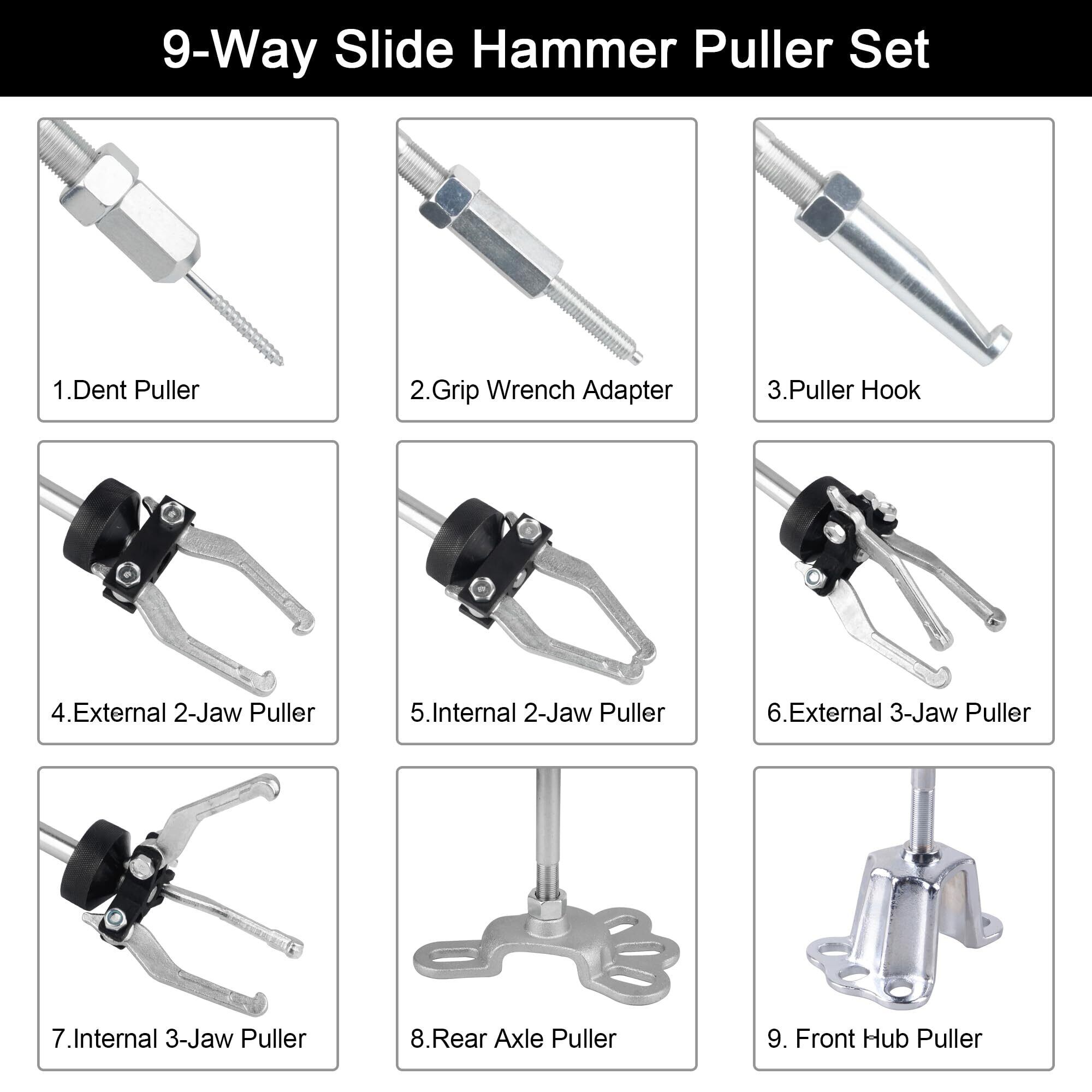 【機能】スライディングハンマーセットはドライブラインの修理・交換や板金作業に欠かせない工具です。車、バイクの整備、タイヤ交換などに役立ちます。シャフトやベアリングはもちろん、プーリーやベアリング等の取り外しも簡単に行えます。